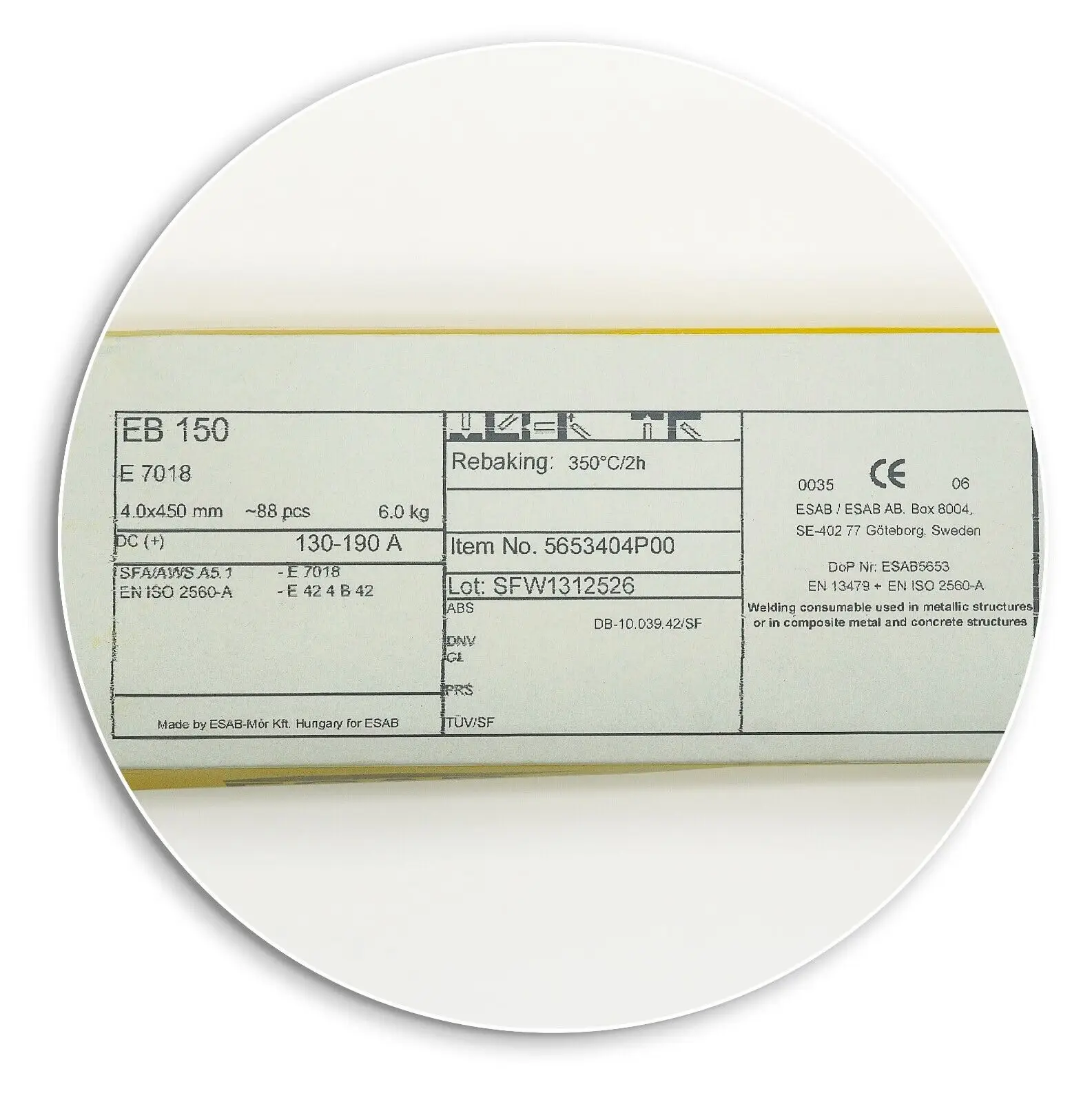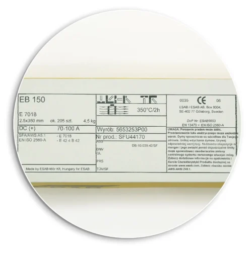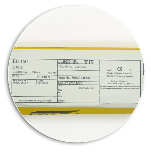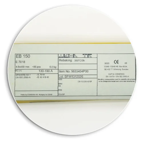 ESAB EB 150 ist eine dick umhüllte Elektrode zum Schweißen von hochfesten Stahlkonstruktionen (Re >= 420 MPa), die hohen statischen und dynamischen Belastungen ausgesetzt sind (Schiffbau, Schienenfahrzeuge, Baumaschinen, etc.).