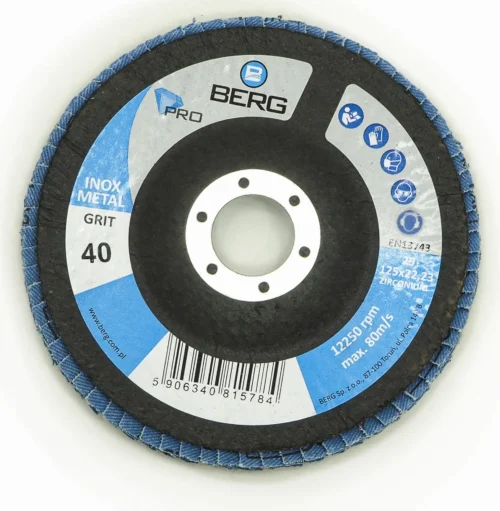 Die BERG Lamellenschleifscheibe Pro Inox GR.40 125×22 Zirkon ist ein hochwertiges Werkzeug zum Schleifen verschiedener Materialien wie Edelstahl, Gusseisen, Holz, Leder, Farben, Lacke, Spachtelmasse, Kunststoffe, Parkett, Aluminium und unlegierte Metalle.