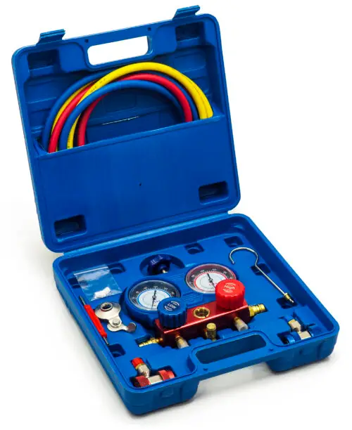 Professionelles Manometer-Set mit drei Servicenschläuchen zur Diagnose von Klimasystemen.