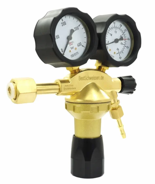 Einstufiger Druckminderer für Argon, CO₂ und Ar/CO₂-Mischungen, geeignet für Gasflaschen mit einem Fülldruck von bis zu 200 bar. Der Druckregler reduziert den Hochdruck der Flasche auf den gewünschten Arbeitsdruck und hält diesen konstant, wodurch ein präziser und gleichmäßiger Schutzgasfluss beim Schweißen mit TIG, MIG oder MAG gewährleistet wird.