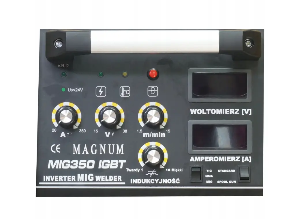 Der MAGNUM MIG 350C IGBT ist ideal zum Schweißen von Kohlenstoffstahl, Edelstahl, Aluminium und seinen Legierungen sowie zum Karosseriereparaturschweißen geeignet. Es handelt sich um ein sehr modernes, energieeffizientes und vielseitiges Gerät, das eine einfache und unkomplizierte Bedienung ermöglicht. Im Lieferumfang sind Zubehör und Verkabelung, eine Anleitung in polnischer Sprache und eine Garantiekarte enthalten.