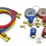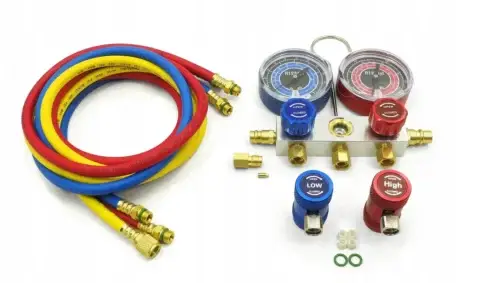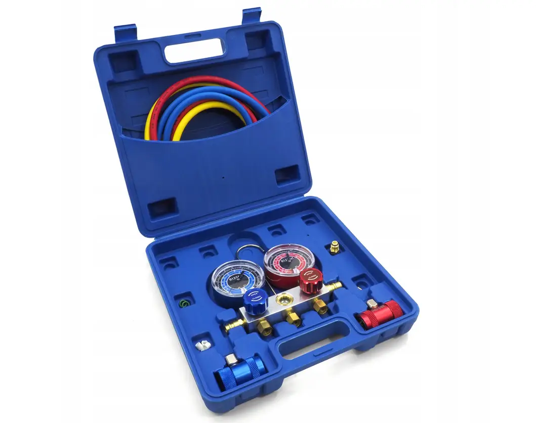 Manometer-Set für Fahrzeug- und stationäre Klimaanlagen mit R1234YF-Kältemittel, inklusive drei farbiger Schläuche (je ca. 140 cm) und Schnellkupplungen für Kfz-Klimaanlagen.
