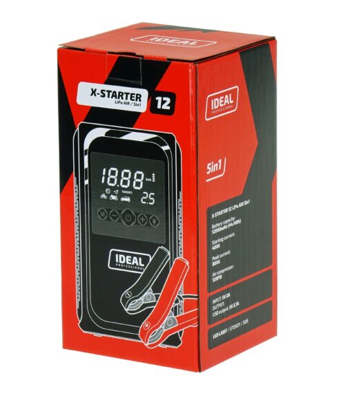 Der IDEAL X-STARTER 12 LiPo AIR 5in1 ist ein tragbares Starthilfe- und Multifunktionsgerät auf Basis eines Lithium-Akkus, das fünf praktische Funktionen in einem Gerät vereint: