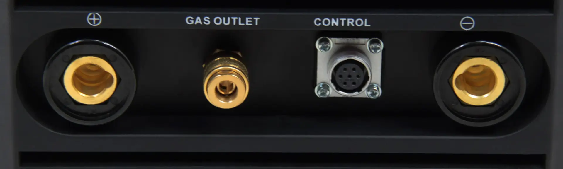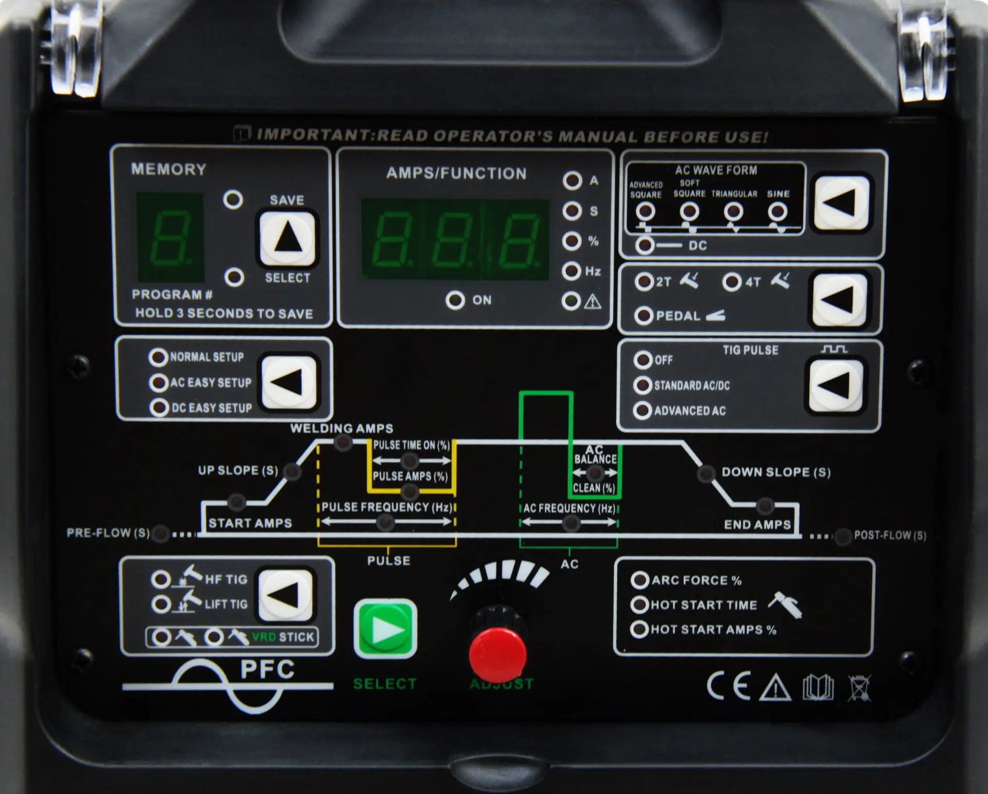 Das Bedienfeld bietet viele Funktionen wie die Einstellung des Schweißstroms, die Möglichkeit zur Fernsteuerung, berührungsloses HF-Zünden und kontaktloses LIFT-Zünden, das zweifunktionale Einstellrad ADJUST (Grobe und feine Einstellung) und viele weitere, die in der Bedienungsanleitung beschrieben sind.