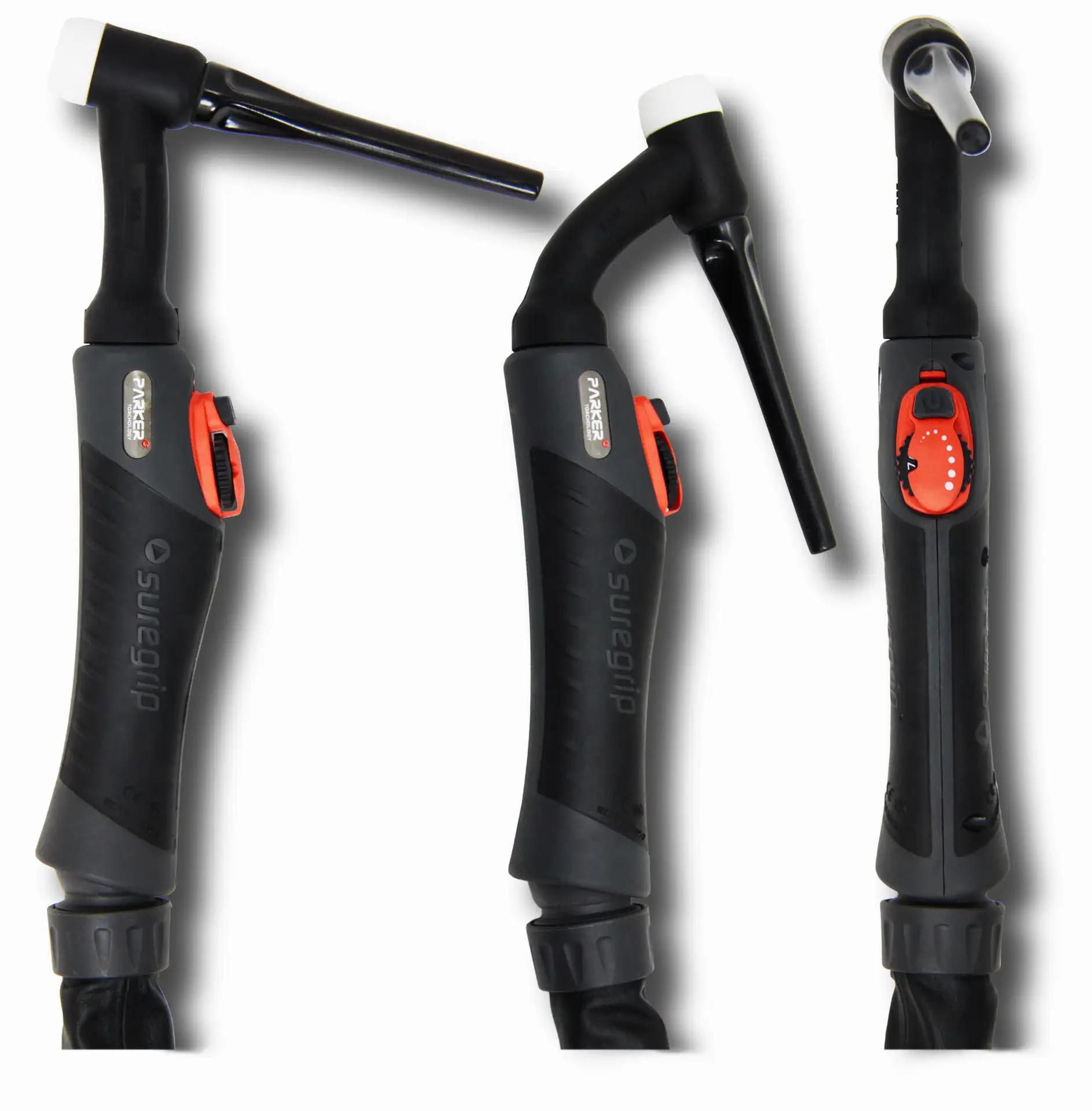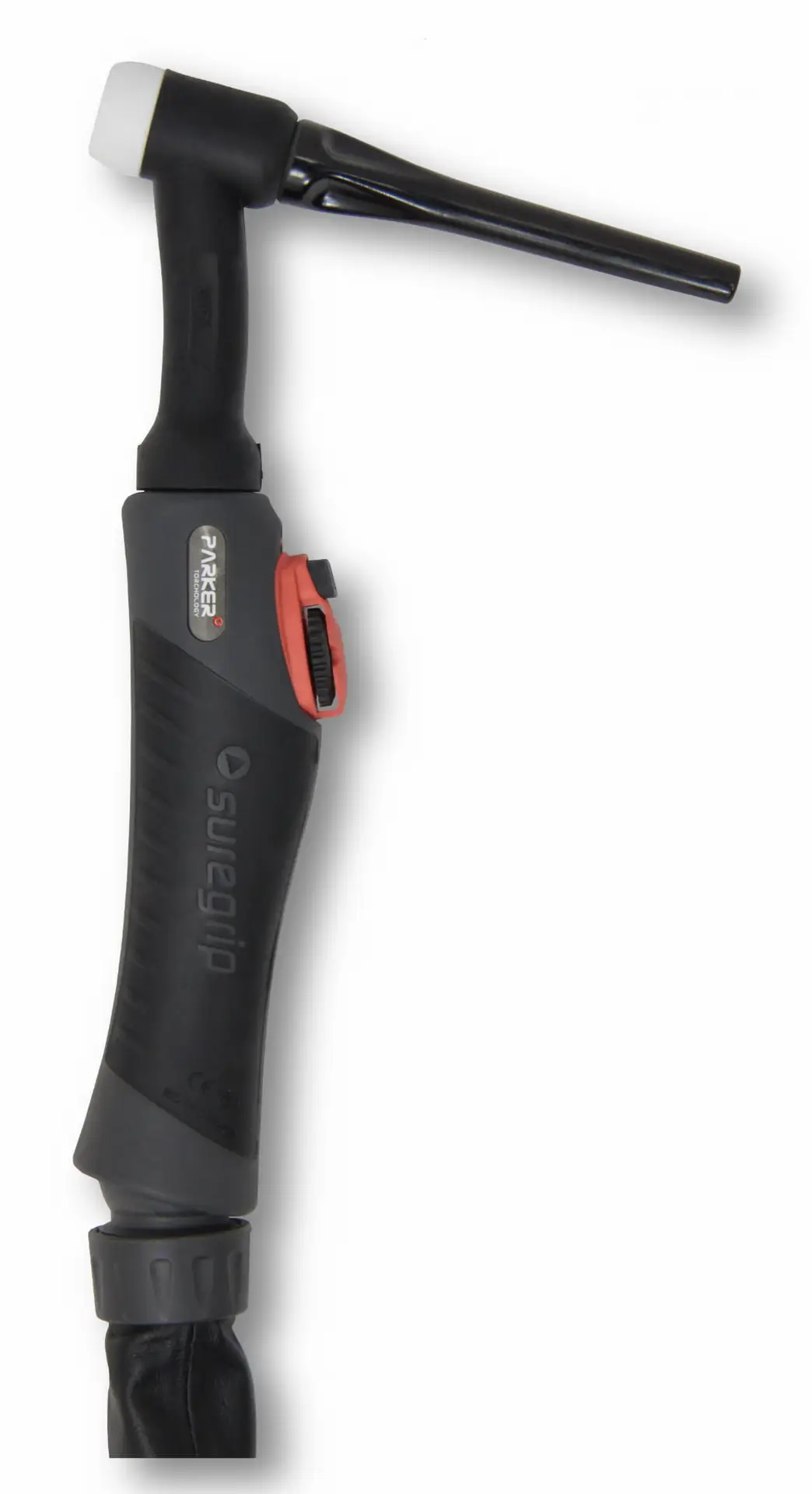 Das Schweißgerät ist mit einem PARKER SUREGRIP SGT26 FLEX TIG SRT 26-4m Schweißbrenner mit einstellbarem Schweißstrom, einem 3m Massekabel, einem 3m Elektrodenhalter und zusätzlichem Zubehör ausgestattet.