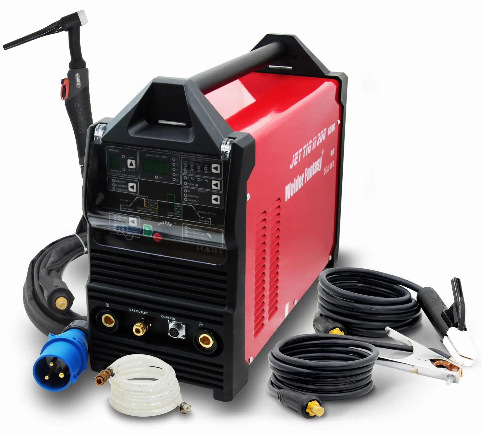 Das JET TIG II AC/DC 200 IGBT PFC ist ein industrielles Inverter-Schweißgerät, das auf der IGBT-Technologie basiert. Es ist für das Schweißen verschiedener Arten von Stahl, Kupfer, Messing, Magnesium, Titan und Aluminiumlegierungen geeignet. Das Schweißgerät wird mit einer Spannung von 230 V betrieben und ist mit einem PFC-Modul (Power Factor Correction) ausgestattet, das den Leistungsfaktor auf einen Wert nahe 1 erhöht und die Verluste in den Industriestromleitungen verringert.