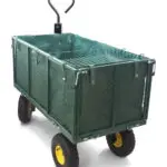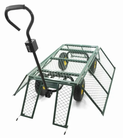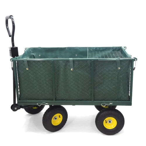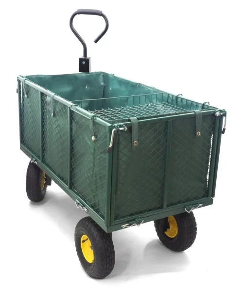 Ein multifunktionaler Transportwagen für Haus- und Gartenarbeiten. Er ermöglicht den einfachen Transport von Lasten bis zu 500 kg. Innen ist er mit einer herausnehmbaren Plane aus robustem Material ausgekleidet, die verhindert, dass Inhalte wie Blätter oder Äste herausfallen.