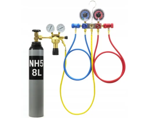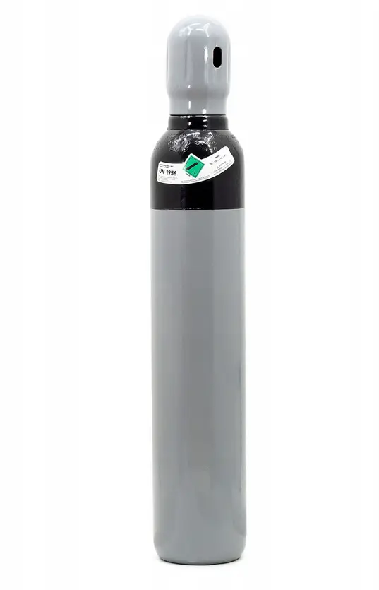 Die Flasche enthält 8 Liter HYDROGEN – ein Gemisch aus 95 % Stickstoff und 5 % Wasserstoff zur Dichtheitsprüfung von Ventilen und Klimaanlagen.