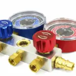 Beide Druckanzeigen sind auf Null einstellbar. Die Skalen zeigen sowohl Temperatur- als auch Druckwerte, inklusive weiterer Kältemittel-Skalen. Austauschbare Kolbenventile sorgen für perfekte Abdichtung.