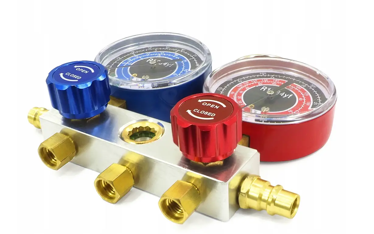 Der Tester hilft bei der Diagnose von Druckunterschieden in der Klimaanlage durch Vergleich von Hoch- und Niederdruck. Der gelbe Serviceschlauch ermöglicht Evakuierung und Befüllung des Systems.