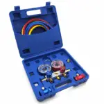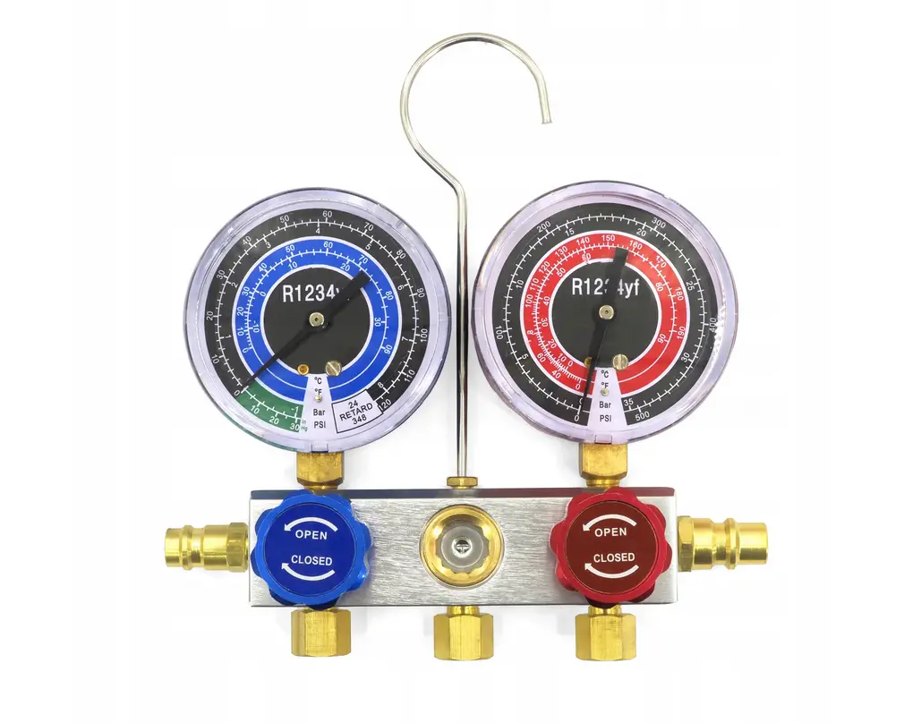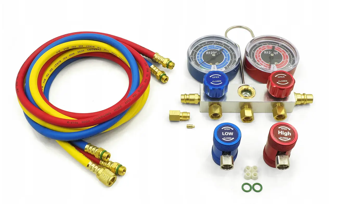 Manometer-Set für Auto- und stationäre Klimaanlagen mit R1234YF-Kältemittel. Enthalten sind drei farbige Schläuche (ca. 140 cm) und Schnellkupplungen.