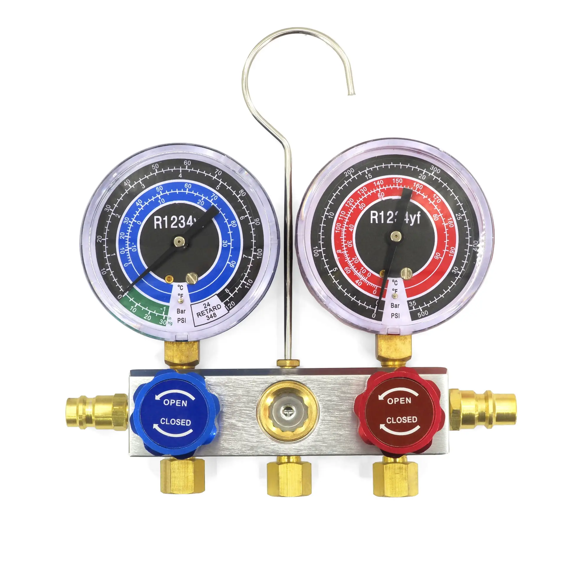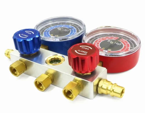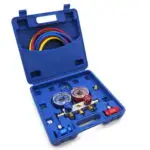 Beide Hoch- und Niederdruckanzeigen lassen sich auf Null kalibrieren. Die Skalen des Verteilers sind in Temperatur- und Druckeinheiten gekennzeichnet und enthalten weitere Kühlsystemskalen. Austauschbare Kolbenventile sorgen für eine perfekte Abdichtung.