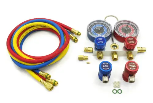 Ein Manometer-Set für Kfz- und stationäre Klimaanlagen mit dem Kältemittel R1234YF. Enthält drei farbige 90 cm lange Schläuche sowie Schnellkupplungen für Kfz-Klimaanlagen.