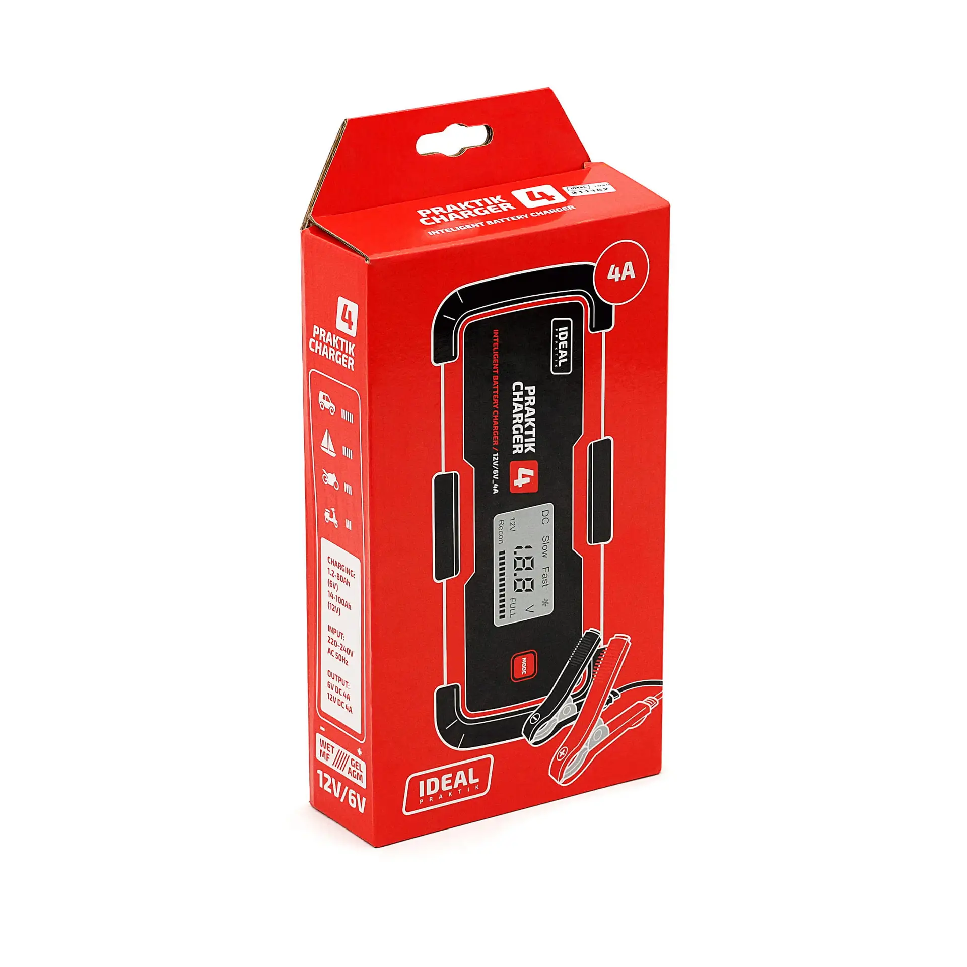 Das IDEAL PRAKTIK CHARGER 4 ist ein intelligentes und tragbares Ladegerät mit Wechselrichterfunktion zum Laden von 6- und 12-Volt-Batterien. Es ist kompatibel mit Blei-Säure-, Gel-, AGM-, MF- und EFB-Batterien. Das Ladegerät verfügt über eine Eingangsspannung von 230V und eine Ladespannung von 6V/12V. Der Ladestrom beträgt 4A. Es schaltet sich automatisch aus, wenn die erforderliche Spannung an der Batterie erreicht ist, und nimmt das Laden automatisch wieder auf, wenn die Spannung abfällt. Der Ladevorgang der Batterien wird vollständig elektronisch gesteuert.