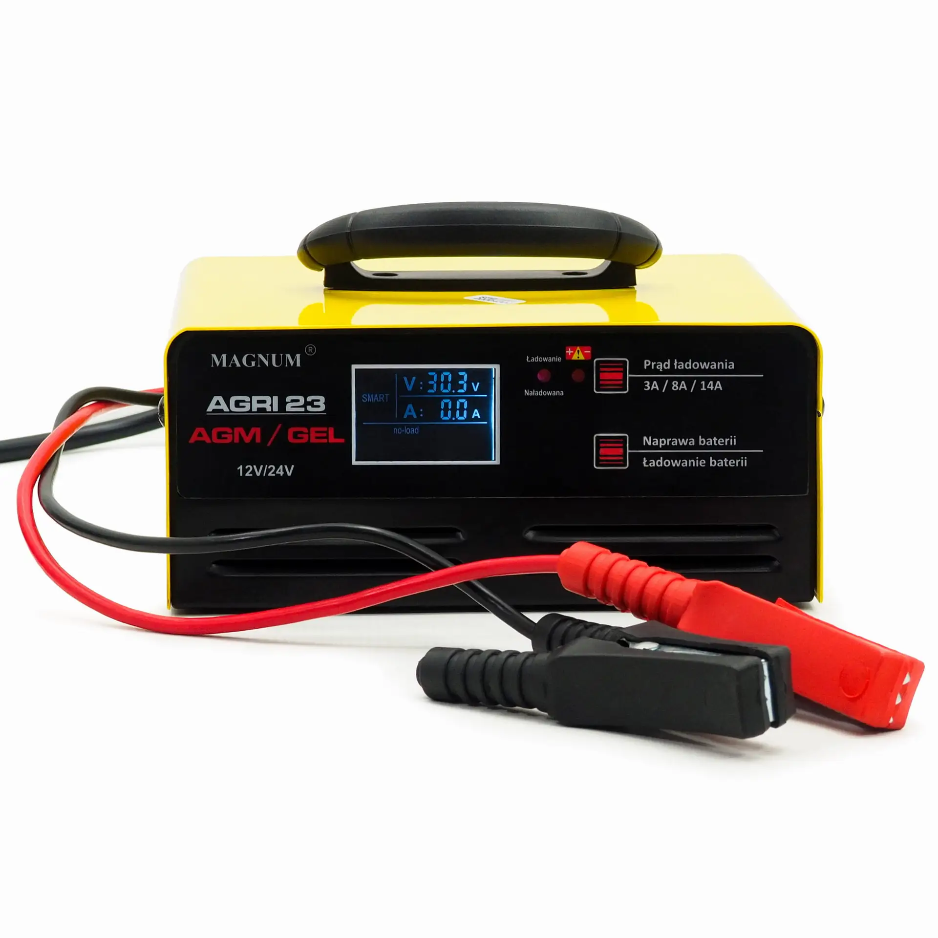 Das MAGNUM AGRI 23 AGM / GEL Batterieladegerät ist ein solide verarbeitetes Gerät mit intelligentem Ladevorgang. Es ist für das Laden von 12V- und 24V-Blei-Säure-Batterien, einschließlich GEL- und AGM-Batterien, konzipiert. Das Ladegerät erkennt automatisch die Batteriespannung und verfügt über ein digitales Ladestrommessgerät mit Display. Es kann auch als tragbares Batterieladungsmessgerät/-tester verwendet werden. Das AGRI 23 AGM / GEL Ladegerät verfügt über drei Betriebsmodi: Reparatur, Laden und Erhaltungsladung. Es ist sicher und effizient und erfüllt die Anforderungen der europäischen CE-Normen.