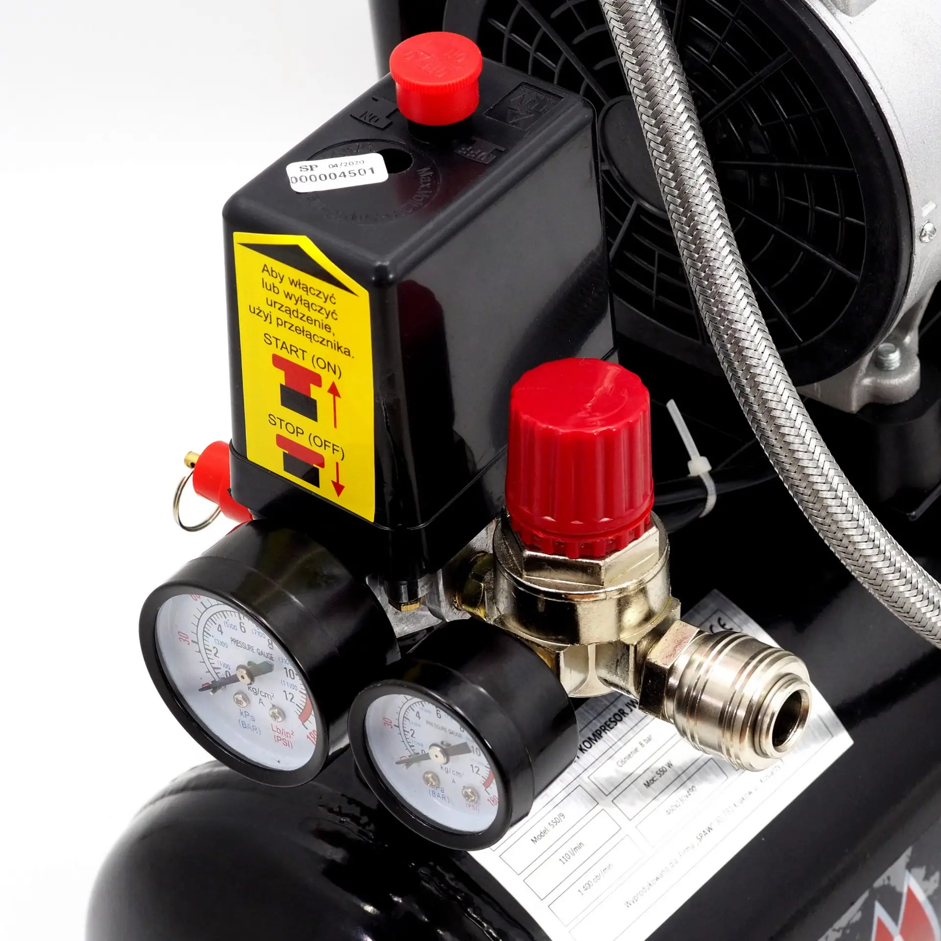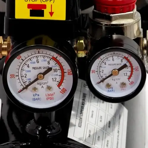 Das Gerät ist mit einem Druckminderer mit Schnellkupplung (Standardprofil Typ 26) ausgestattet. Der Regler verfügt über zwei Manometer und eine Druckeinstellvorrichtung zur einfachen Anpassung des Ausgangsdrucks.
