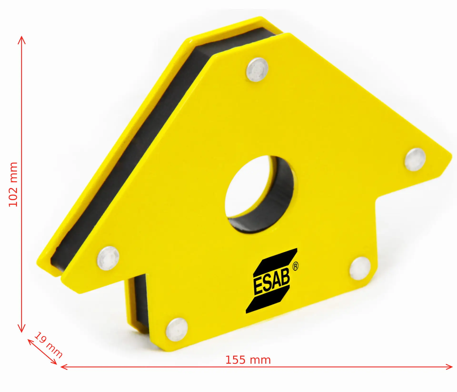 Der große magnetische Winkelmesser ESAB zeichnet sich durch hohe Festigkeit aus und ermöglicht das Halten von geschweißtem Material mit einem Gewicht von bis zu 80 kg in horizontaler Position. Die Hebekapazität von 27,5 kg ermöglicht eine stabile Positionierung des geschweißten Elements während der Arbeit.