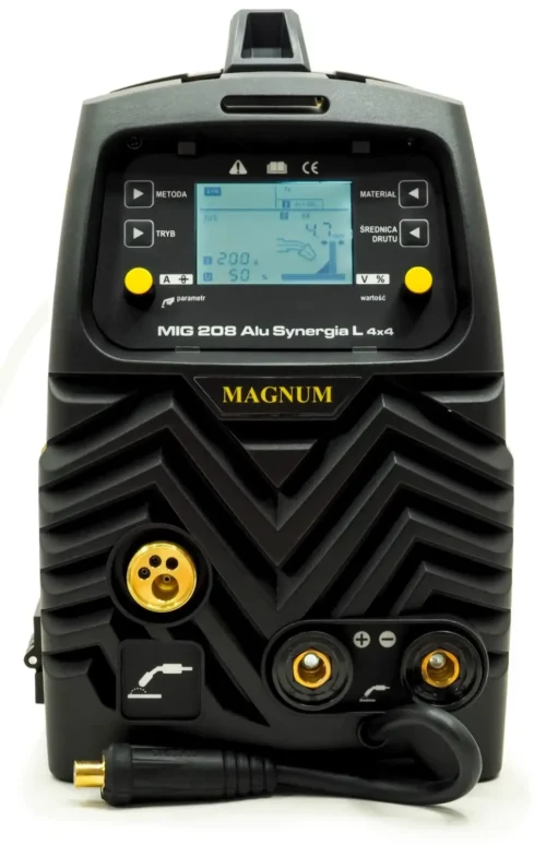Der MAGNUM MIG 208 Alu Synergia L 4×4 ist ein leistungsstarkes Inverter-Schweißgerät für MIG/MAG, MMA, WIG Lift, FCAW und Hartlöten. Es wurde für Profis und ambitionierte Anwender entwickelt, die Vielseitigkeit, Präzision und Zuverlässigkeit erwarten – vom Karosseriebau bis zur Industrie.