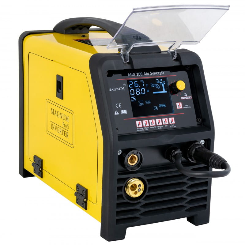 MAGNUM MIG 209 Alu Synergia Schweißgerät ist ein professioneller, synergischer Schweißhalbautomat, der für manuelles, elektrisches Schweißen von unlegiertem Kohlenstoffstahl, niedriglegiertem Stahl (MAG), legierten Stählen sowie Aluminium und seinen Legierungen (MIG) entwickelt wurde.