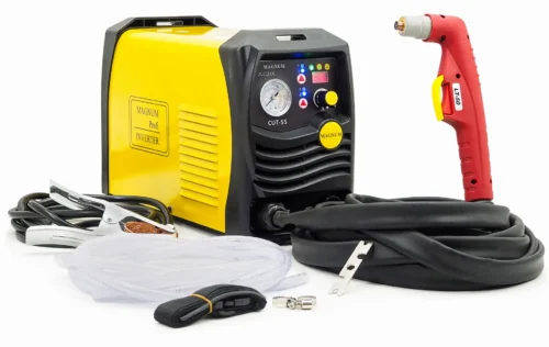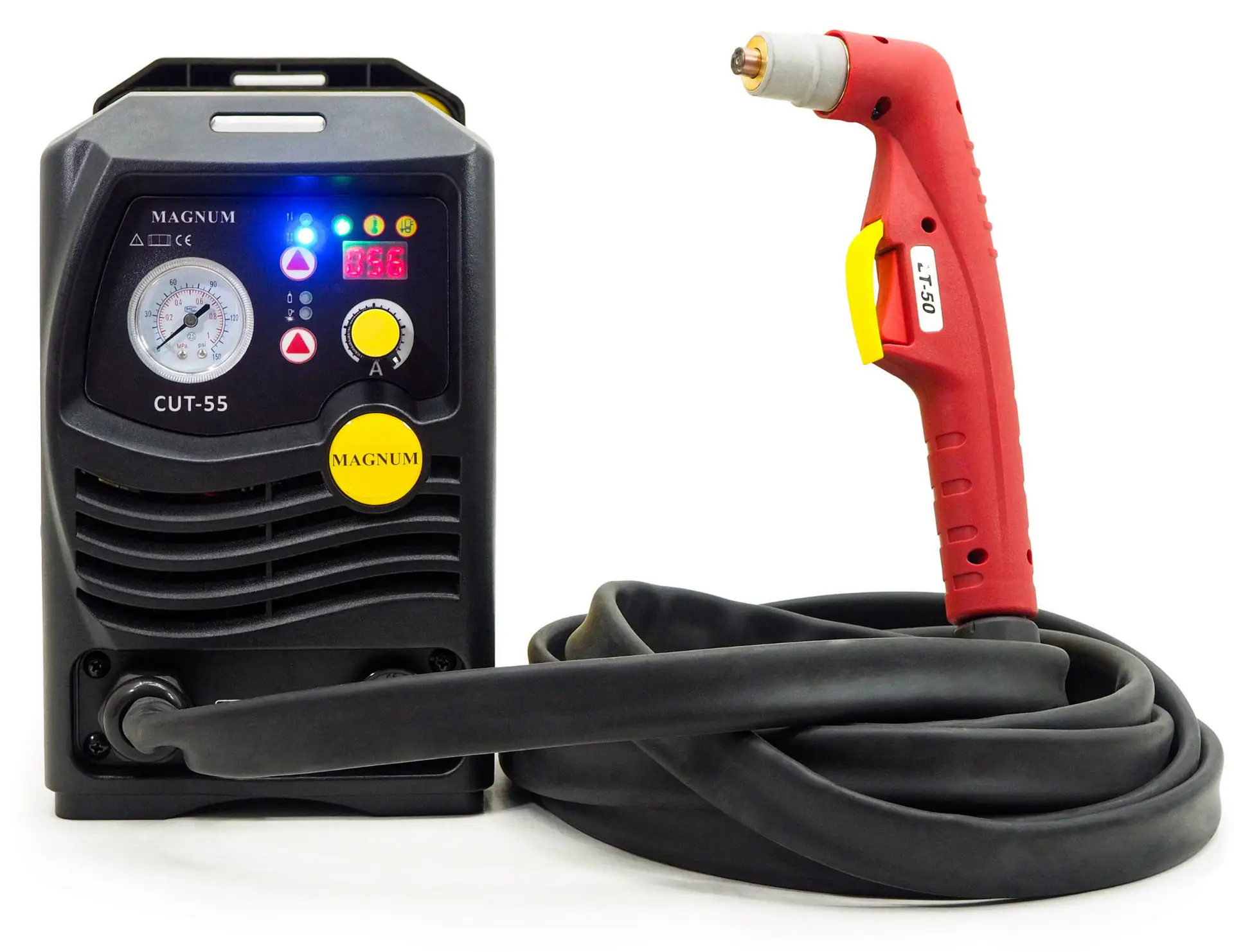 Der Plasmaschneider MAGNUM CUT-55 ist für das manuelle oder maschinelle Schneiden von elektrisch leitenden Elementen aus Kohlenstoff- und Legierungsstahl, Aluminium und seinen Legierungen, Messing, Kupfer sowie Gusseisen mit Plasma vorgesehen. Es handelt sich um ein hervorragend gefertigtes professionelles Gerät eines bekannten Herstellers.