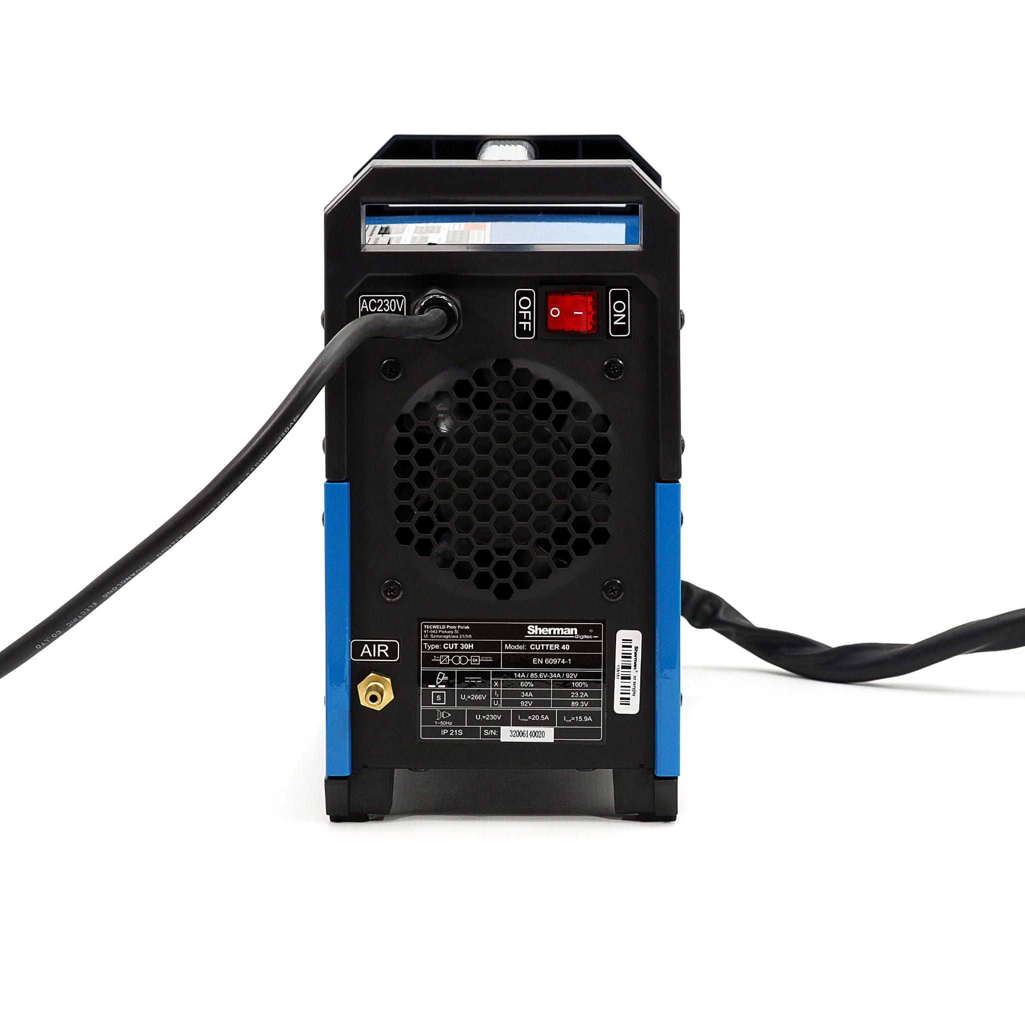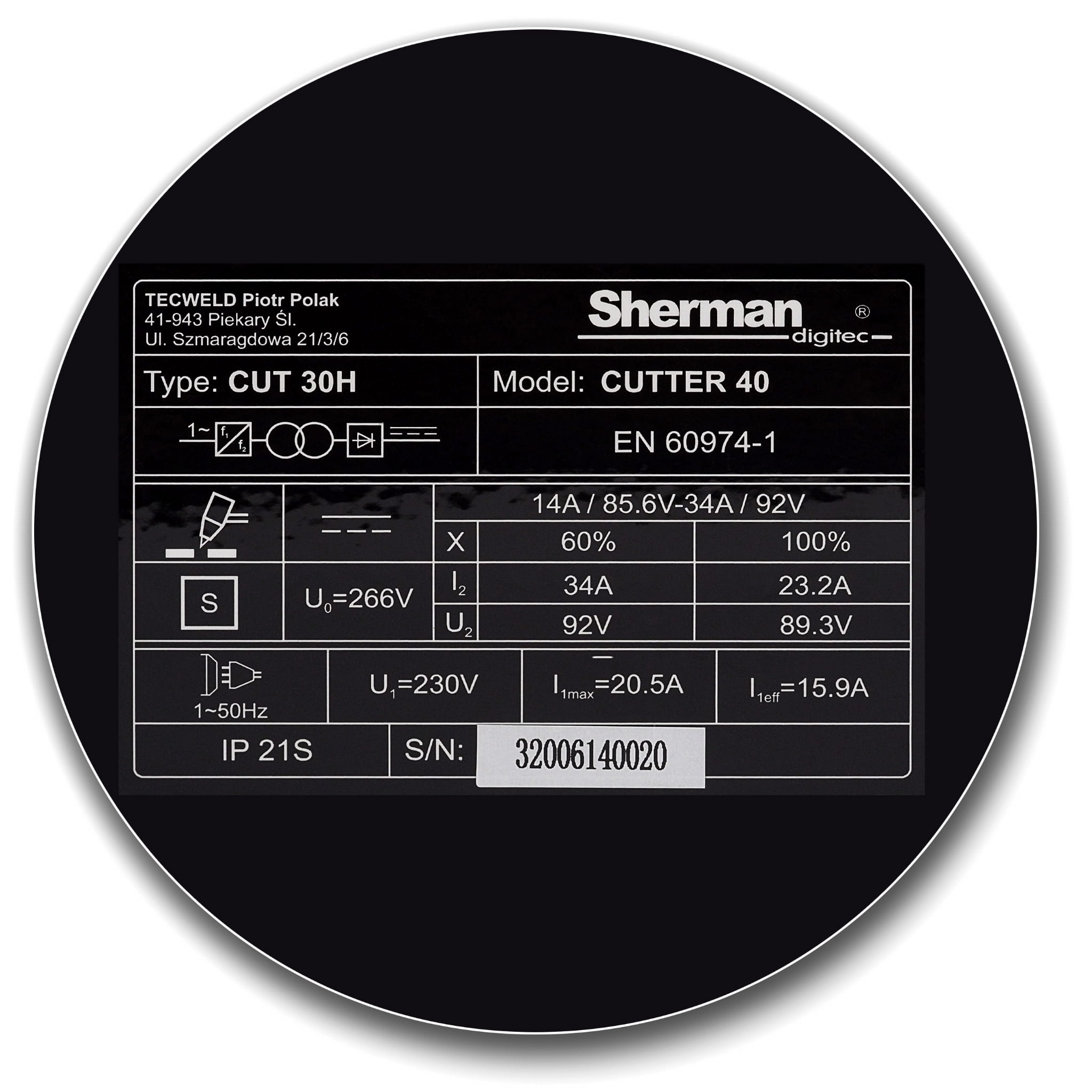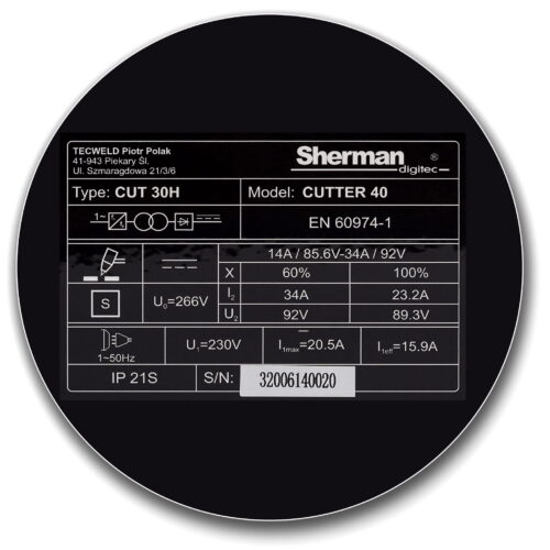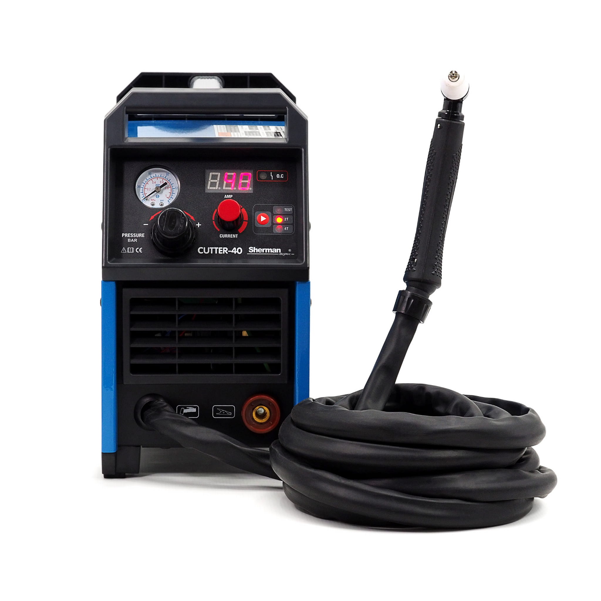 Der Sherman CUTTER 40 Plasmaschneider ist ein MOSFET-Invertergerät mit einer Frequenz von 100 kHz, das zum Schneiden von Blechen und Stahl-, Aluminium- und Kupferteilen mit Plasma verwendet wird. Er eignet sich ideal für Reparatur- und Servicearbeiten in geschlossenen oder überdachten Räumen, die nicht direkten atmosphärischen Einflüssen ausgesetzt sind. Der Schneidbrenner ist mit einem integrierten 5-Meter-ESAB-Standardgriff mit berührungsempfindlicher Zündung sowie einem eingebauten Luftvorbereitungssystem mit Druckminderer und Manometer ausgestattet, das die Druckregelung und -kontrolle vom Bedienfeld aus ermöglicht. Im Lieferumfang enthalten sind der Sherman CUTTER 40 Plasmaschneider, ein 5 Meter langer PT-31-Plasmaschneidgriff, ein 3 Meter langes Massekabel, ein Druckluftschlauch mit Klemmbändern, eine Elektrode und eine Düse, eine Bedienungsanleitung in polnischer Sprache sowie eine Garantiekarte.