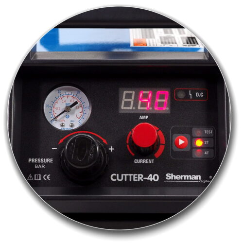 - Der eingebaute Druckminderer mit Filter und Manometer sowie das digitale Stromdisplay sorgen für Präzision und Kontrolle beim Schneiden.