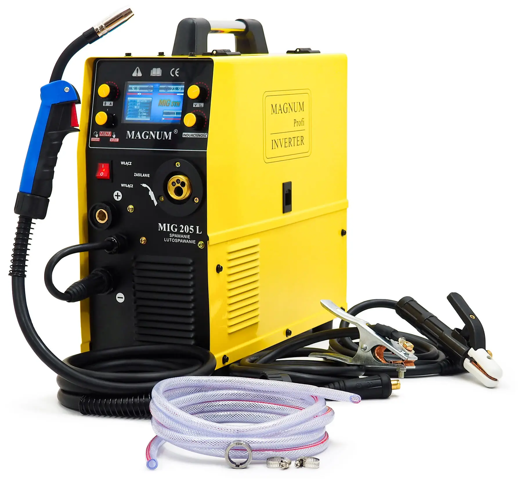 Das MAGNUM MIG 205L Schweißgerät ist ein professioneller Schweißautomat, der für das Schweißen verschiedener Stahlsorten, Aluminium und Löten entwickelt wurde. Es ist ein ideales Werkzeug sowohl für industrielle Anwendungen als auch für Werkstätten. Dank der synergischen Einstellungen und des gut lesbaren LCD-Bildschirms ist das Schweißgerät auch für Personen mit geringer Erfahrung einfach zu bedienen.