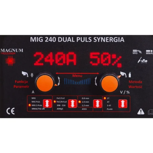 Die MAGNUM MIG 240 DUAL PULS SYNERGIA ist ein synergischer Einphasen-Schweißautomat mit einer Spannungsversorgung von 230V. Es ist das ideale Gerät zum elektrischen Schweißen verschiedener Arten von Stahl, Aluminium und deren Legierungen. Mit einer hohen Schweißstromstärke von 240A und der Möglichkeit des Schweißens mit der MMA- und TIG-Lift-Methode ist dieser Schweißautomat zuverlässig und langlebig, was ihn sowohl in Werkstätten als auch in Industriefabriken einsetzbar macht.