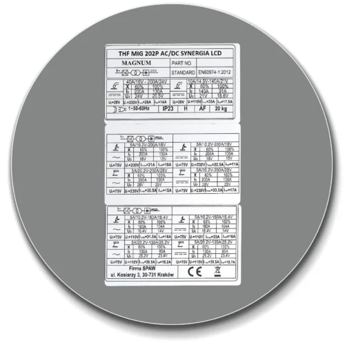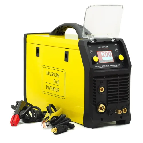 Das Schweißgerät MIG/TIG THF MIG MAGNUM 202P AC/DC SYNERGIA LCD ist eine neue Version eines professionellen Schweißgeräts, das das Schweißen mit der HF-Zündungsmethode ohne Kontakt, das MIG/MAG-Schweißen mit Synergie und das MMA-Schweißen mit umhüllten Elektroden ermöglicht. Dank der Möglichkeit des Wechselstromschweißens eignet sich das Gerät ideal für die Verbindung verschiedener Elemente, einschließlich Aluminium-, Kupfer-, Magnesiumlegierungen und vielen anderen. Das Set enthält alle notwendigen Zubehörteile wie TIG- und MIG/MAG-Schweißbrenner, Kabel mit Elektrodenhaltern und Klemmen, Gasschlauch sowie eine Bedienungsanleitung in polnischer Sprache und eine Garantiekarte.
