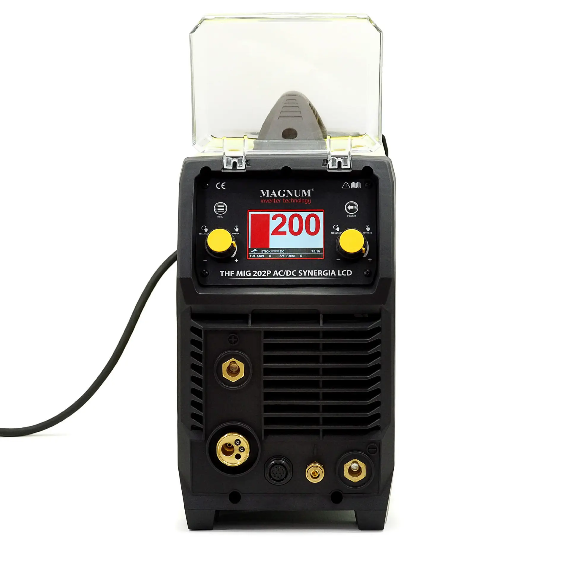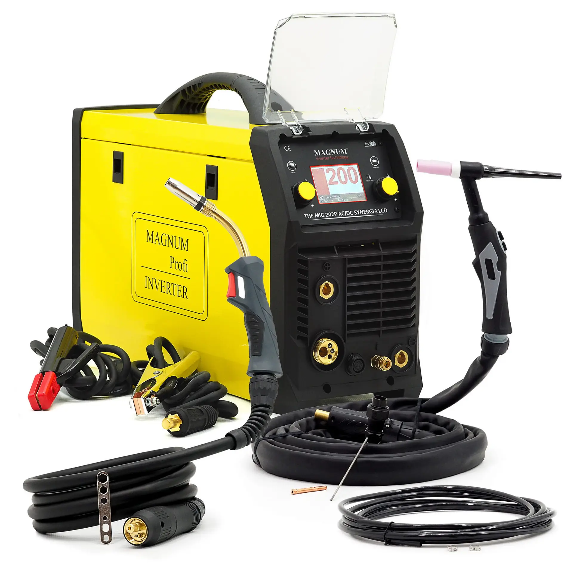 Das Schweißgerät MIG/TIG THF MIG MAGNUM 202P AC/DC SYNERGIA LCD ist eine neue Version eines professionellen Schweißgeräts, das das Schweißen mit der HF-Zündungsmethode ohne Kontakt, das MIG/MAG-Schweißen mit Synergie und das MMA-Schweißen mit umhüllten Elektroden ermöglicht. Dank der Möglichkeit des Wechselstromschweißens eignet sich das Gerät ideal für die Verbindung verschiedener Elemente, einschließlich Aluminium-, Kupfer-, Magnesiumlegierungen und vielen anderen. Das Set enthält alle notwendigen Zubehörteile wie TIG- und MIG/MAG-Schweißbrenner, Kabel mit Elektrodenhaltern und Klemmen, Gasschlauch sowie eine Bedienungsanleitung in polnischer Sprache und eine Garantiekarte.