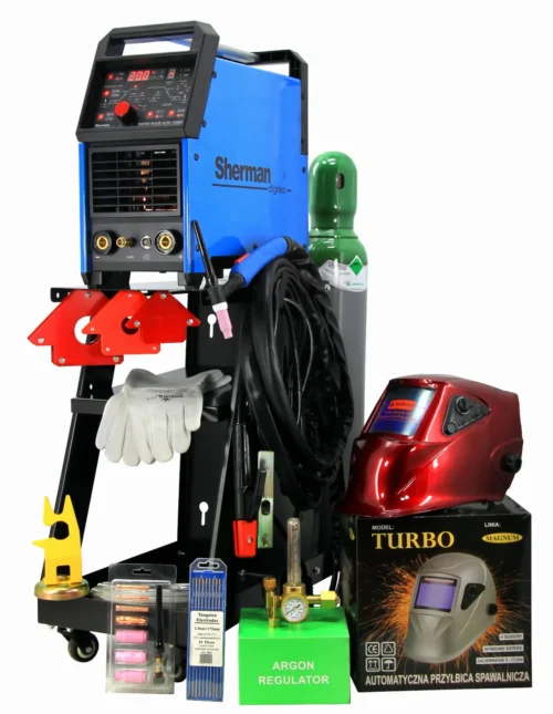 Das Schweißset Sherman DIGITIG AC DC200 GD PULS TURBO ist ein professionelles Gerät zum manuellen Schweißen von TIG-Stahl und Buntmetallen mit Gleich- und Wechselstrom. Ausgestattet mit IGBT-Technologie und digitalem Steuerungssystem bietet der DIGITIG PULSE AC/DC 200GD Schweißer einen breiten Einstellbereich für Schweißparameter, Lichtbogencharakteristik und Pulsfunktion. Das Set enthält alle notwendigen Zubehörteile wie Schweißgriffe, Kabel, Druckminderer mit Rotameter, Schweißwagen, automatische Schweißmaske, Argongasflasche, Schweißerhandschuhe und Schweißwinkel.