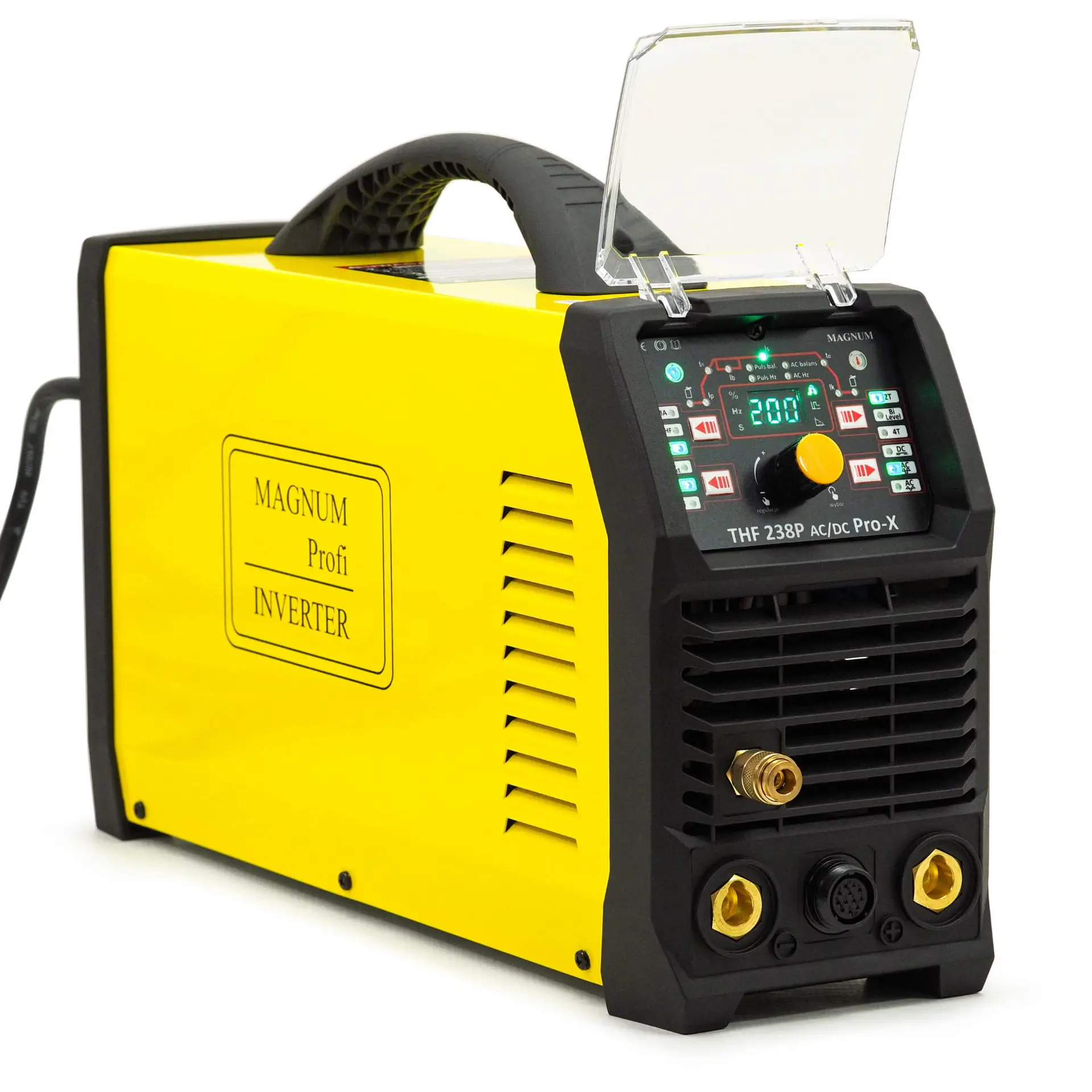 Die TIG MAGNUM THF 238 PRO-X AC/DC PULS 230V ist ein professionelles Invertergerät für das manuelle, elektrische Schweißen mit der TIG-Methode. Sie kann auch zum Schweißen mit der MMA-Methode unter Verwendung von umhüllten Elektroden verwendet werden. Sie eignet sich ideal für alle Arten von Schweißarbeiten in Schlossereien, Werkstätten, Industrie- und Fabrikbetrieben.