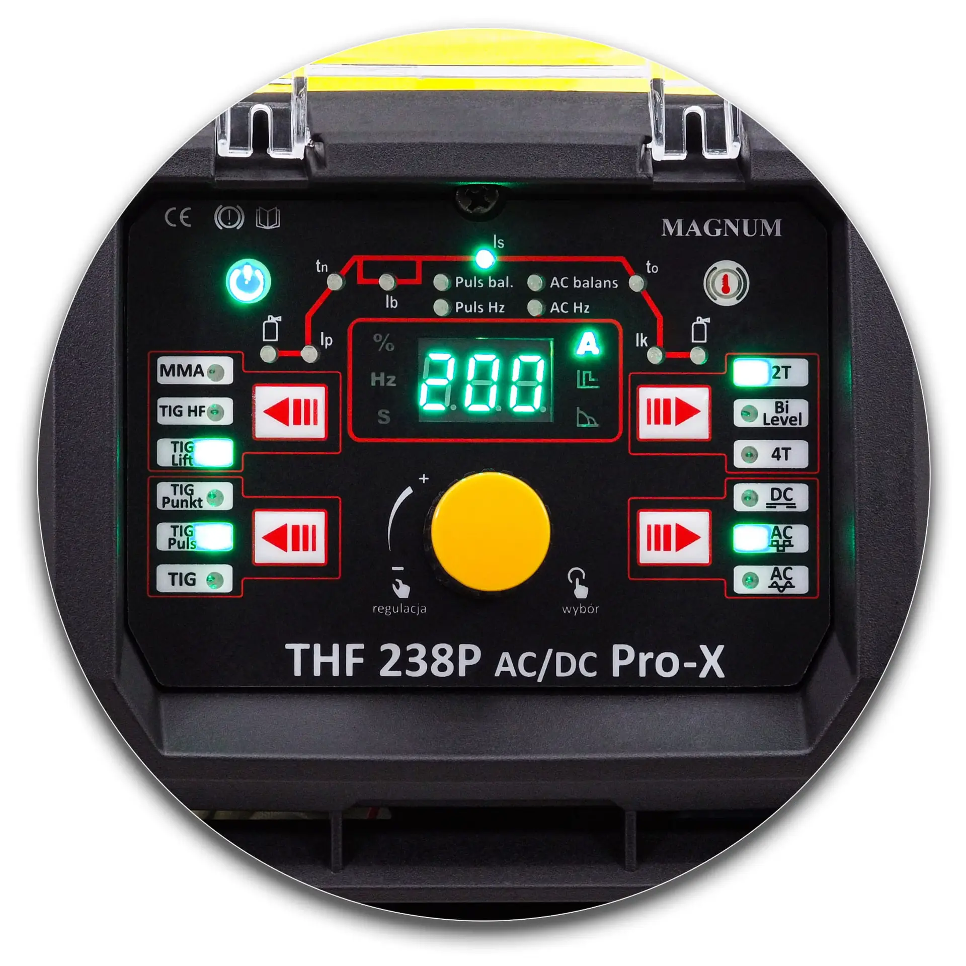 Die MAGNUM THF 238 PRO-X AC/DC PULS 230V Schweißmaschine ist mit einer professionellen BI-LEVEL Steuerung ausgestattet, die das Umschalten zwischen zwei Schweißstromwerten ohne Unterbrechung der Arbeit ermöglicht. Dies ist besonders nützlich beim Schweißen von Aluminium oder Materialien mit unterschiedlicher Dicke. Das Gerät kann auch mit einer Fernbedienung für Fußsteuerung verbunden werden.