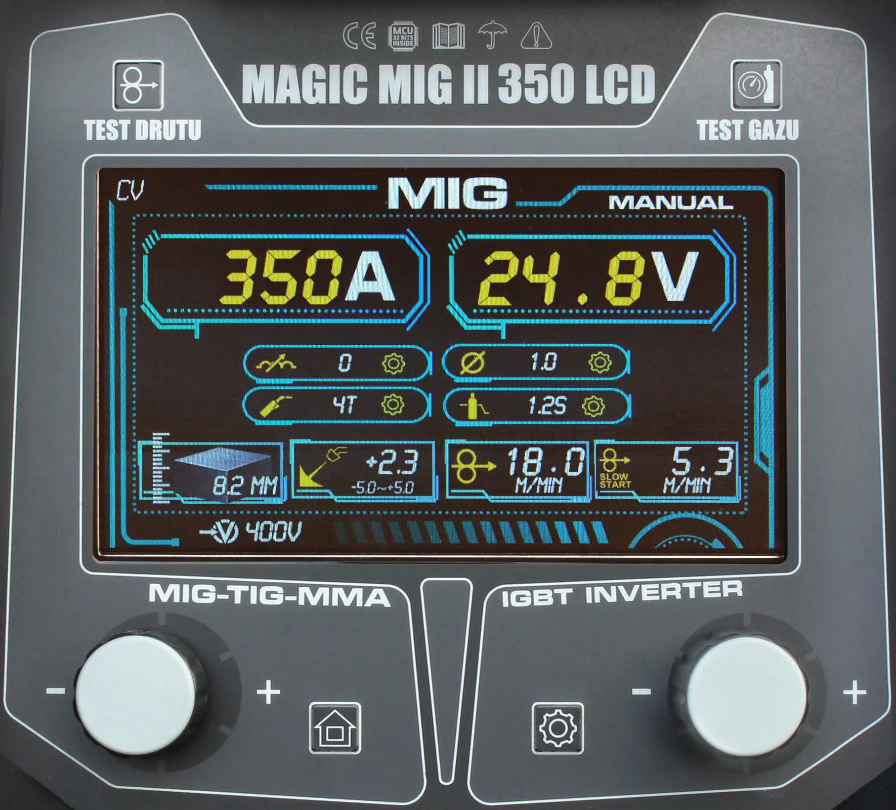Das Schweißgerät Welder Fantasy MAGIC MIG II 350 LCD 4×4 ist solide verarbeitet und mit modernen Technologien wie IGBT-Transistoren ausgestattet, die einen stabileren, stärkeren und fokussierteren Lichtbogen ermöglichen. Das Gerät ist einfach zu bedienen dank des intuitiven Bedienfelds mit Farbdisplay, das eine schnelle Einstellung aller wichtigen Schweißparameter ermöglicht. Das Schweißgerät ist auch mit einem Überlastungsschutzsystem ausgestattet, das die integrierten Schaltkreise vor Überhitzung schützt.