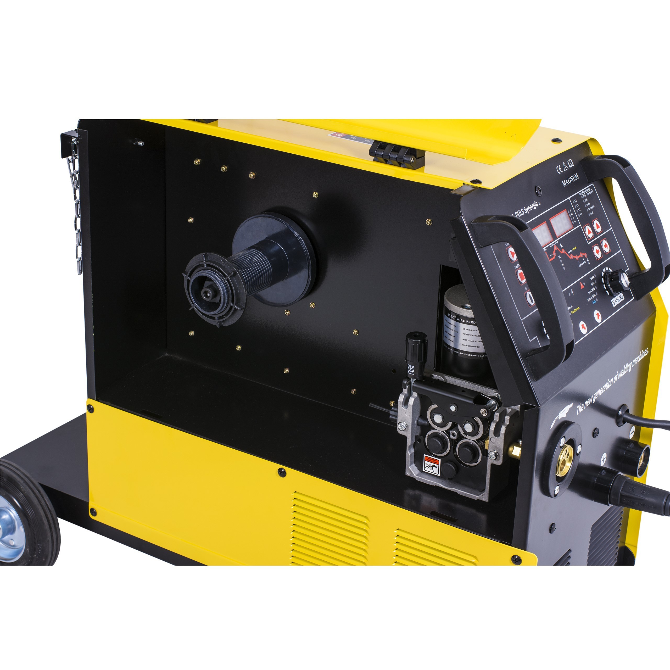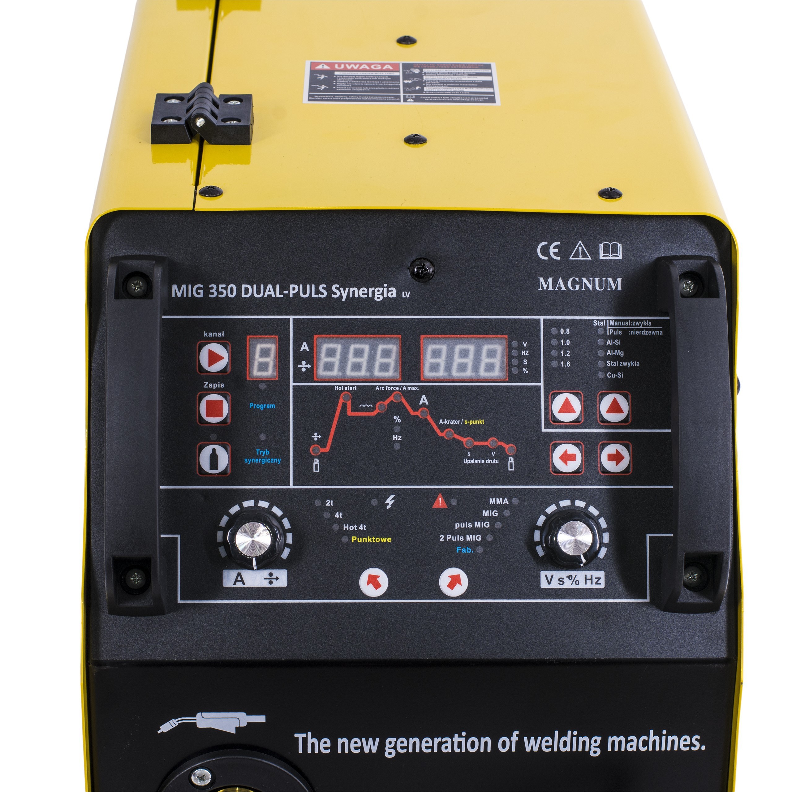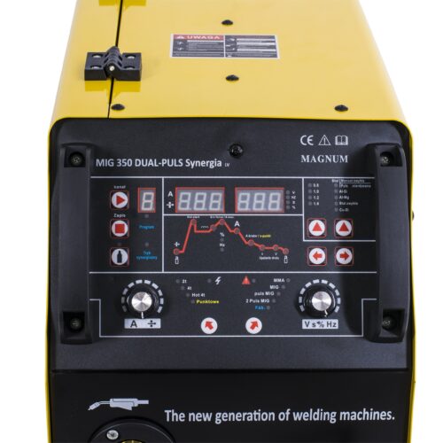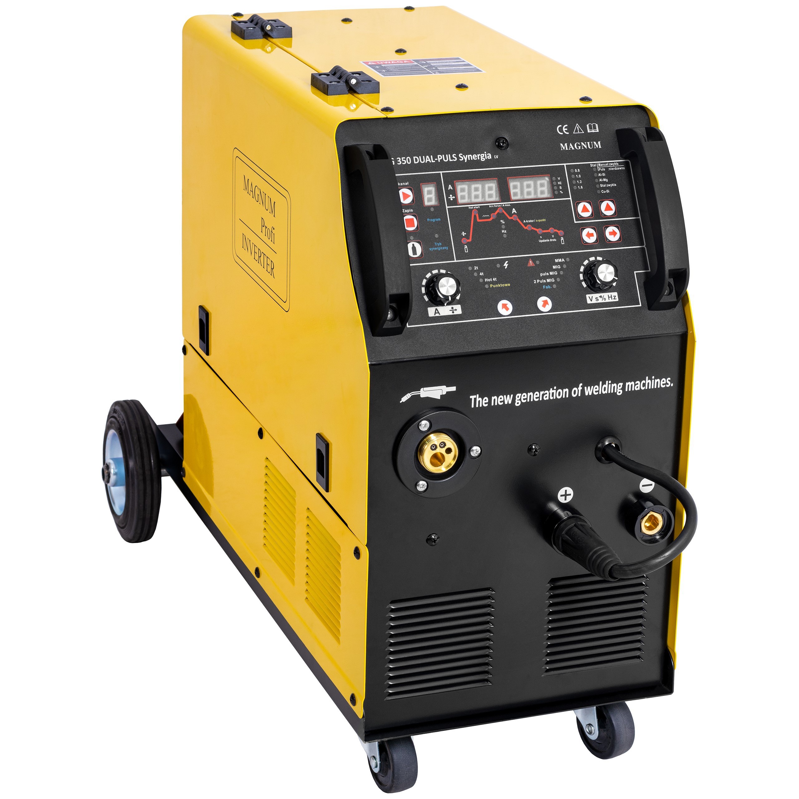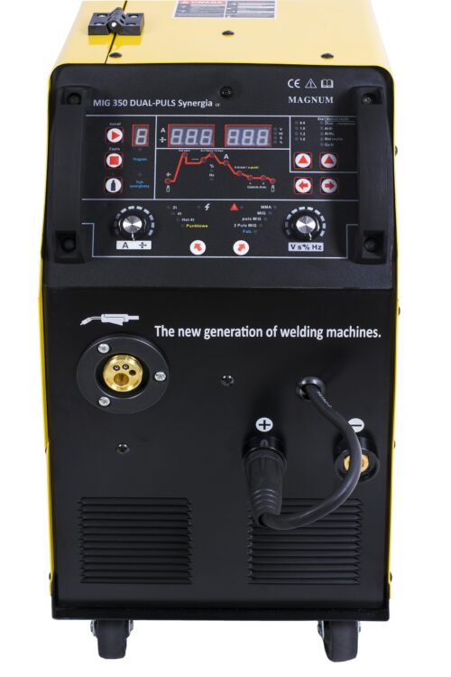 MAGNUM MIG 350 Dual Puls Synergia ist ein professioneller Schweißhalbautomat, betrieben mit einem dreiphasigen 400 V-Netz und einem maximalen Schweißstrom von 350 A. Der MIG 350 ist vor allem für das Schweißen von Edelstahl, Aluminium sowie unlegiertem, niedriglegiertem und hochlegiertem Stahl sowie Kupfer geeignet.