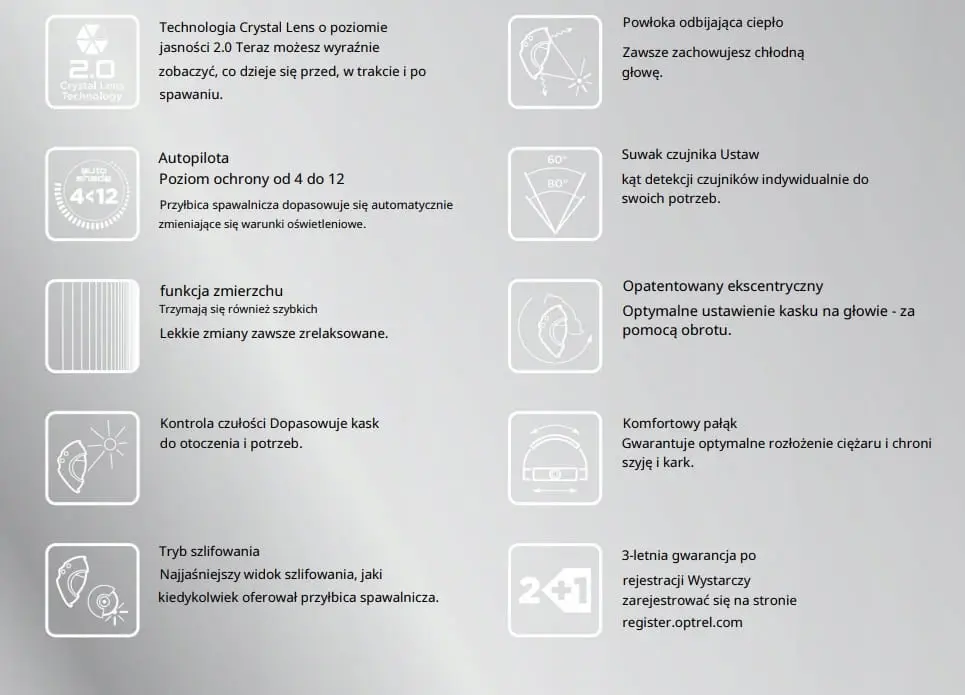 - Autopilot-Funktion – Dank eines zusätzlichen Sensors passt der Helm automatisch den Verdunkelungsgrad an die äußeren Bedingungen im breiten Bereich von 4-12 DIN an und ermöglicht zusätzlich eine manuelle Einstellung von ± 2.