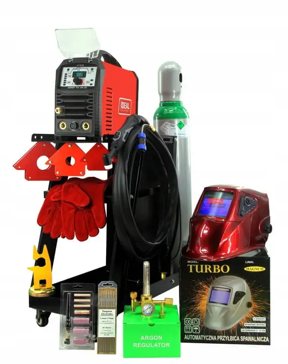 Das tragbare Stromquelle Schweißset Ideal Expert TIG 200 DC PULS ermöglicht das Schweißen mit der TIG- und TIG PULS-Methode sowie mit der MMA-Stabelektrode mit Gleichstrom (DC). Es ist sowohl für Werkstattarbeiten als auch für den Einsatz im Freien ideal geeignet. Das Set enthält den Schweißgerät Ideal Expert TIG 200 DC PULS, den TIG-Schweißbrenner SR-26 mit Griffregelung, den Elektrodenhalter, das Massekabel, die Argon-Gasflasche, den Schweißwagen, den Gasflaschenregler mit Rotameter, den Magnum Turbo Automatikhelm, die Schweißhandschuhe, die Schweißwinkel, den TIG-Griffständer, die Bedienungsanleitung in polnischer Sprache und die Garantiekarte.