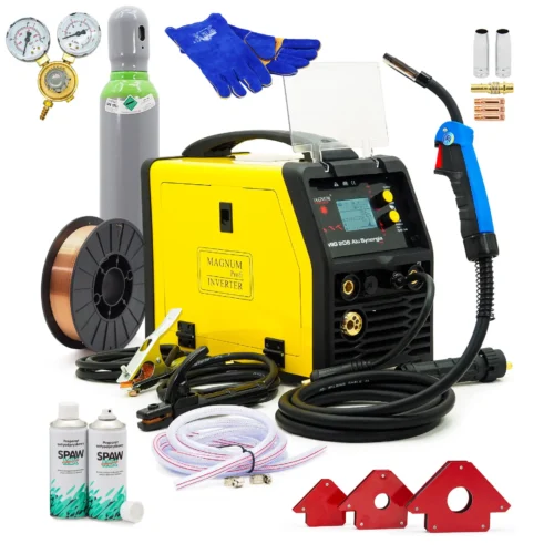 Das Magnum MIG 208 ALU SYNERGIA Schweißset der Marke MAGNUM ist ein technologisch fortschrittliches Schweißgerät, das das Schweißen mit den Methoden MIG-MAG, MMA, TIG LIFT, FCAW und LUTOSPAWANIA ermöglicht. Es ist für das manuelle, elektrische Schweißen verschiedener Arten von Stahl, Aluminium, Kupfer, Lötspalten usw. vorgesehen. Das Set enthält alle notwendigen Zubehörteile wie Schweißgriff, Kabel, Gasflasche, Schweißdraht, magnetische Winkel, Schweißerhandschuhe, Antispritzmittel und vieles mehr.