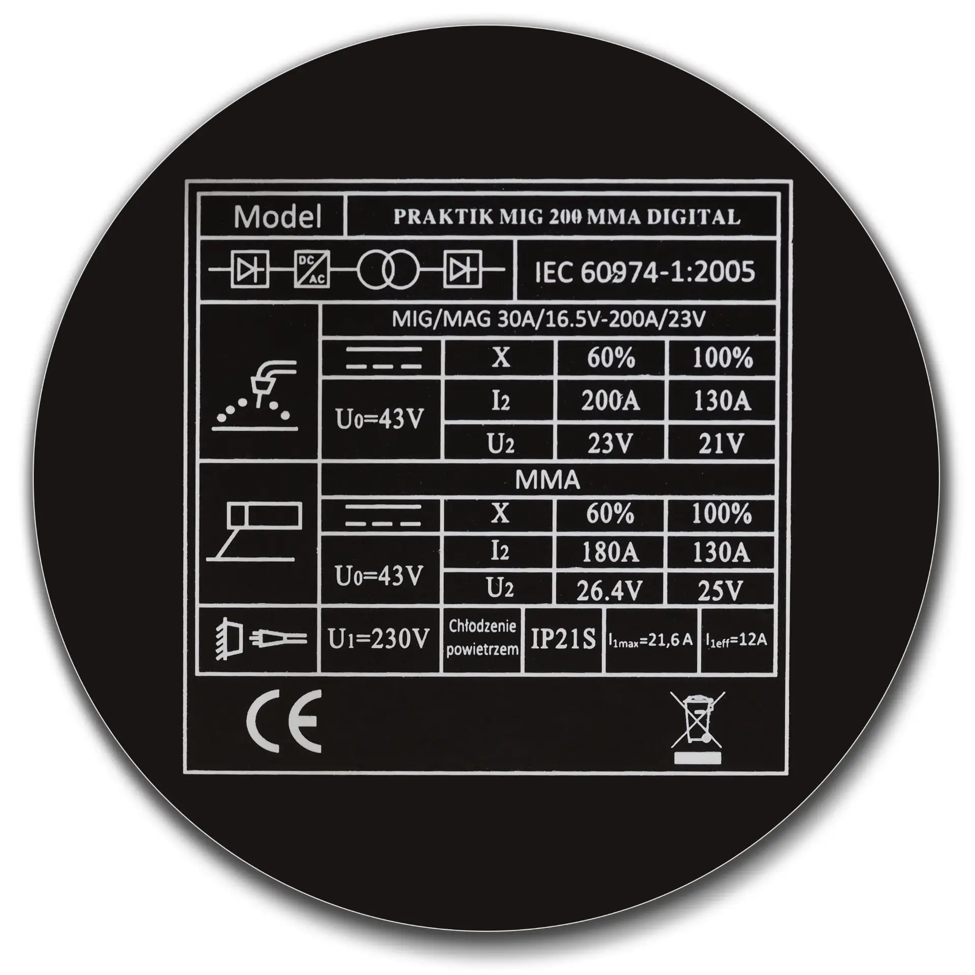 Das Schweißset PRAKTIK MIG 200 IGBT 200A ESAB Flasche Schweißhelm Reduzierer Draht ist ein mobiles und vielseitiges Gerät, das verschiedene Schweißmethoden ermöglicht und eine manuelle Einstellung der Parameter bietet. Dank der IGBT-Invertertechnologie gewährleistet es einen stabilen und starken Lichtbogen. Es ist mit einem 2-Rollen-Drahtvorschub ausgestattet, der die Verwendung von D100- und D200-Draht ermöglicht.