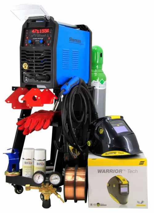 Das Schweißset SHERMAN DIGIMIG 200 PULSE TIG MMA 3-in-1 ESAB ist ein innovatives Gerät zum manuellen Schweißen von Stahl und Buntmetallen mit den Methoden MIG/MAG, MMA (Elektrodenummantelung) und Lift TIG. Es richtet sich an Fachleute, die hohe Qualität und Zuverlässigkeit schätzen. Das Set enthält alle notwendigen Zubehörteile wie die MIG-Schweißmaschine SHERMAN DIGIMIG 200 DUAL PULS, Schweißgriffe, Kabel, Schweißwagen, automatische ESAB SAVAGE A40 Schweißmaske, Schweißdraht, Gasflasche, Druckminderer, Spritzschutzmittel, Schweißerhandschuhe, magnetische Winkel, MIG-Griffständer, Bedienungsanleitung in Polnisch und Garantiekarte.