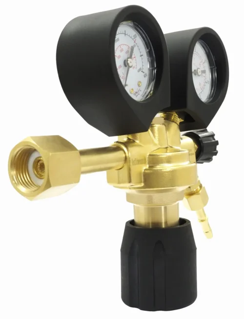 Einstufiger Flaschendruckminderer für Argon, CO₂ und Gasmischungen. Er reduziert den Druck des aus der Flasche strömenden Gases auf einen konstanten Arbeitsdruck. Dank präziser Regelung ermöglicht er einen verlustarmen Gasverbrauch.