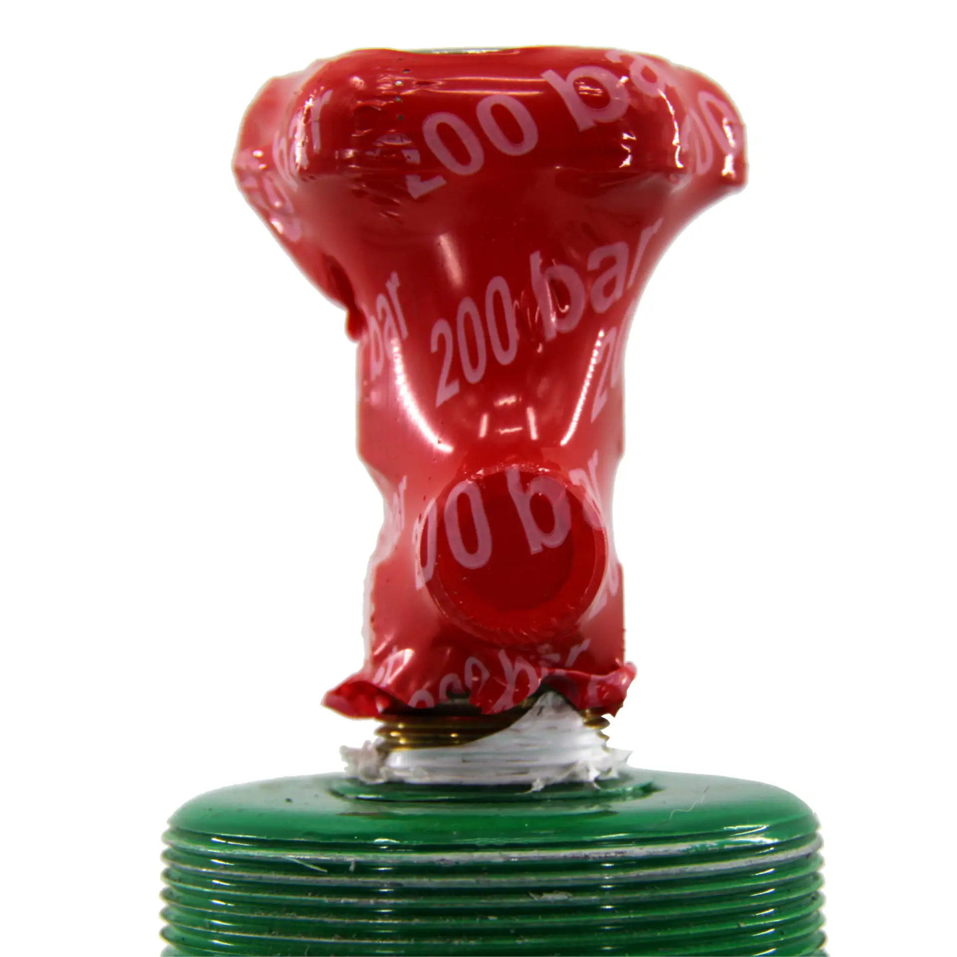 Ein robuster Schutzkappenaufsatz schützt das Flaschenventil während Lagerung und Transport. Die Flasche ist neu, voll gefüllt und hat einen Arbeitsdruck von 200 bar.