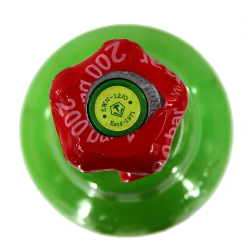 Ein Schutzkappenaufsatz schützt das Ventil bei Transport und Lagerung vor Beschädigungen. Die Flasche ist fabrikneu, voll gefüllt und hat einen Arbeitsdruck von 200 bar.