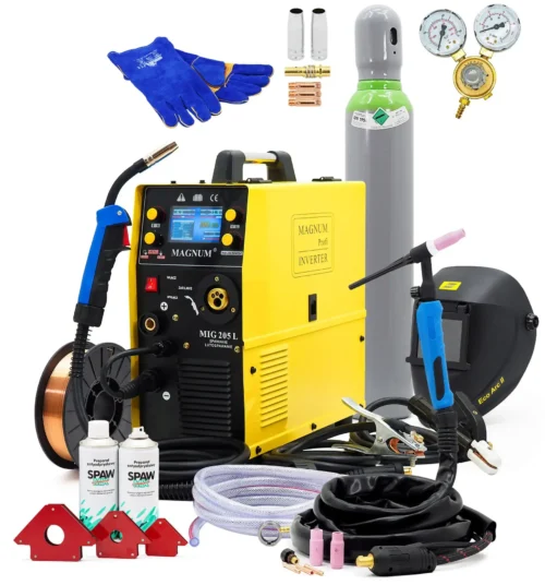 Der MAGNUM MIG 205L SCHWEIßEN LCD 200 A + TIG-Griff ist ein professioneller MIG-Schweißautomat, der das Schweißen verschiedener Arten von Stahl, Aluminium und deren Legierungen sowie das Löten ermöglicht. Er eignet sich sowohl für industrielle als auch für Werkstattanwendungen. Das Gerät ist einfach zu bedienen dank der synergischen Einstellungen und des gut lesbaren LCD-Bildschirms. Das Set enthält alle notwendigen Zubehörteile wie Schweißgriff, Kabel, Gasflasche, Schweißhelm, Schweißdraht und Satz magnetischer Winkel.