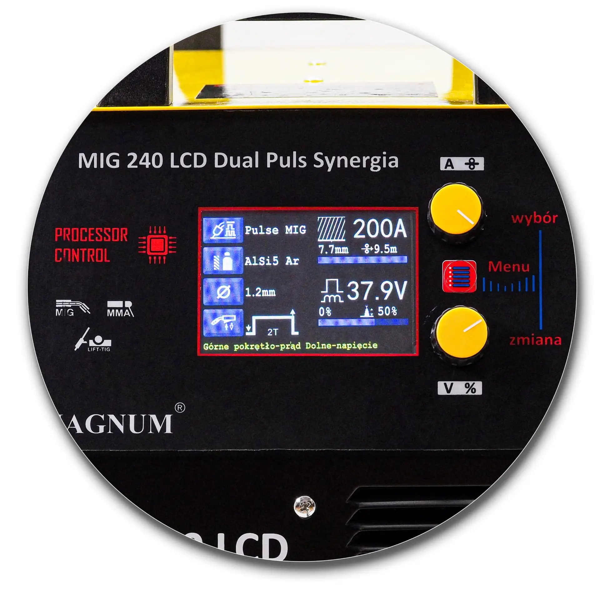 Beschreibung: Das MAGNUM MIG 240 DUAL PULS LCD 240 Flasche Drahtregler Set ist ein professionelles Werkzeug zum Schweißen mit der MIG/MAG-Methode. Dieses fortschrittliche Set bietet eine hohe Schweißqualität und Präzision.
