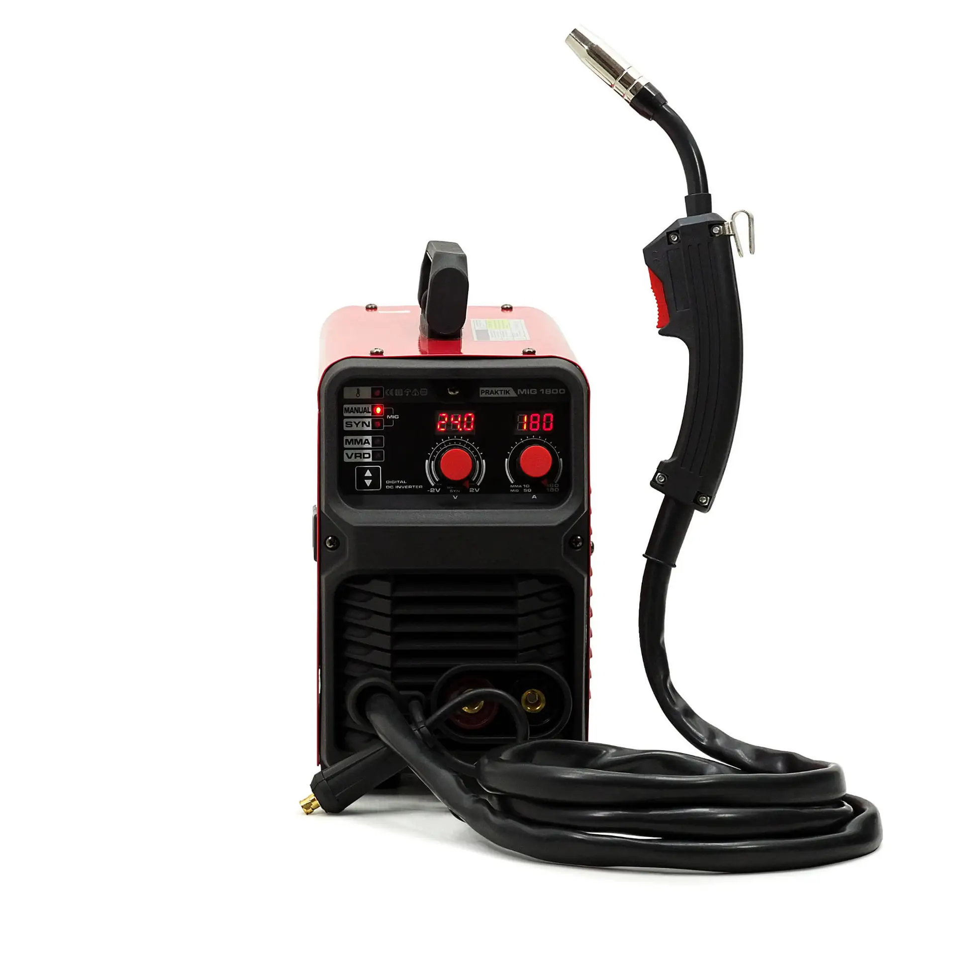 • Einstellbereich des Schweißstroms: 50 – 180 A (MIG/MAG) / 10 – 160 A (MMA)