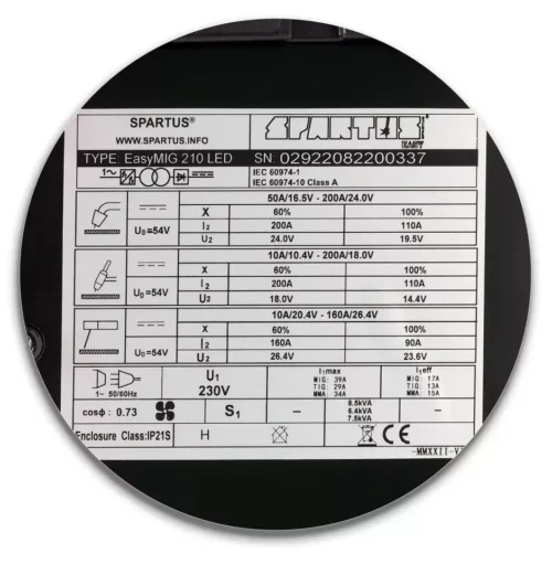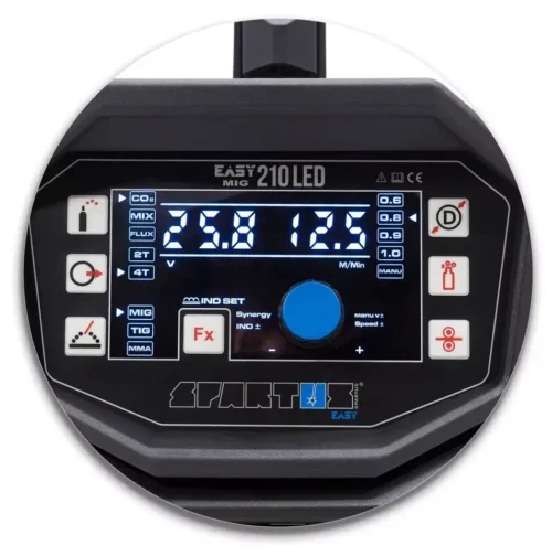 SPARTUS® EasyMIG 210LED ist mit einem synergetischen System zum MIG/MAG-Schweißen mit Stahldrähten von 0,6 / 0,8 / 0,9 /1,0 mm Durchmesser mit der Möglichkeit der manuellen Einstellung der Parameter ausgestattet.
