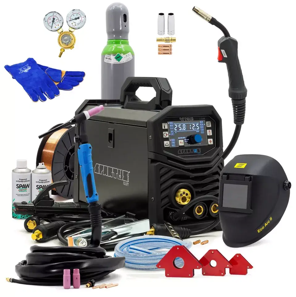 Die SPARTUS® EasyMIG 210LED ist eine kleine halbautomatische Schweißmaschine auf Basis von IGBT-Transistoren. Es kann MIG/MAG, TIG Lift-Schweißen bis zu 200A und MMA-Schweißen bis zu 160A. Die Stromversorgung erfolgt über einphasiges 230V-Netz.