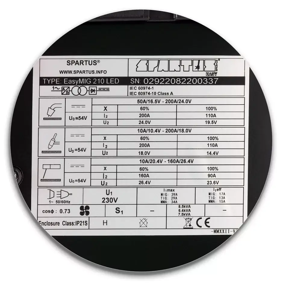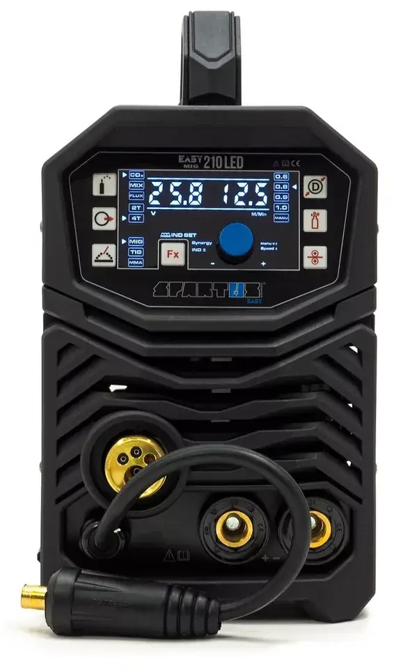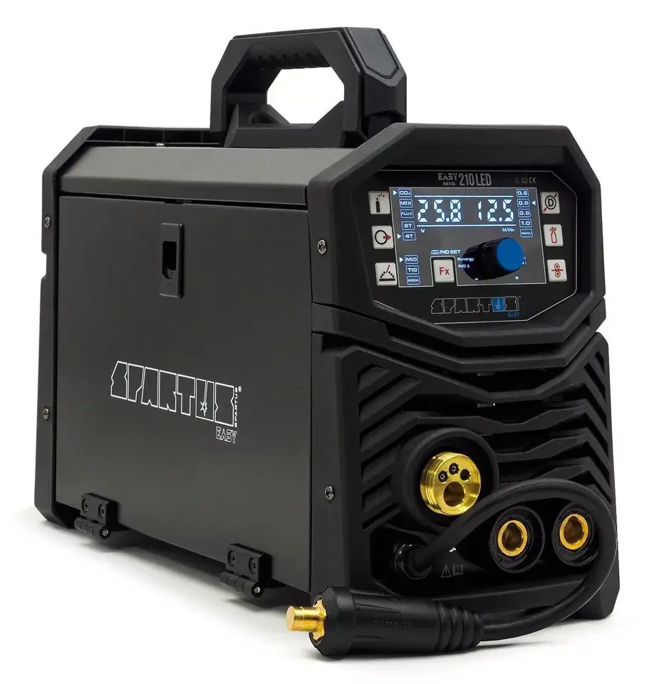 SPARTUS® EasyMIG 210LED ist mit einem synergetischen System zum MIG/MAG-Schweißen mit Stahldrähten von 0,6 / 0,8 / 0,9 /1,0 mm Durchmesser mit der Möglichkeit der manuellen Einstellung der Parameter ausgestattet.