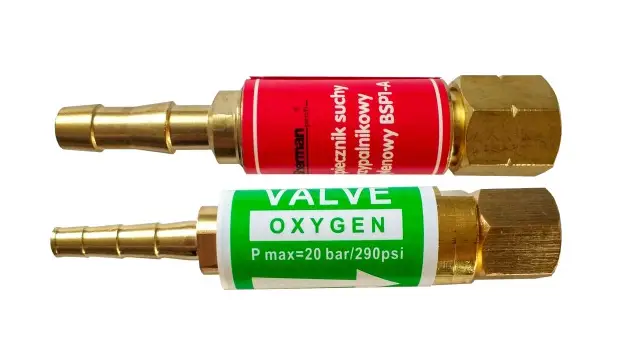 Die Brenner-Sicherung 1/4 RH SAUERSTOFF + 3/8 LH ACETYLEN ist ein Set von Sauerstoff- und Acetylen-Sicherungen, die dazu dienen, die Gasversorgungsanlage des Brenners vor den Auswirkungen einer Flammenrückführung zu schützen. Sie verhindern den Gasfluss in entgegengesetzter Richtung zum normalen Durchfluss. Das Produkt ist neu und mit einer Garantie versehen.